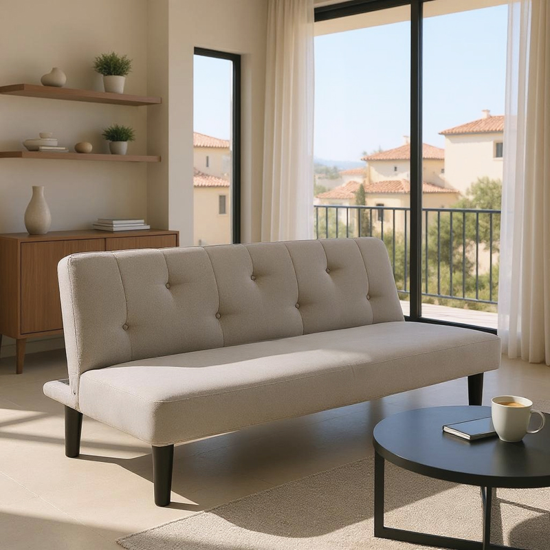 - Φέρει εύχρηστο μεταλλικό μηχανισμό «click-clack» που με μία μόνο κίνηση μετατρέπει τον καναπέ σε κρεβάτι και το αντίστροφο.