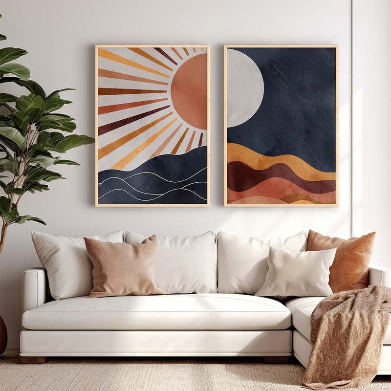 Φέρτε στο σπίτι σας την ισορροπία του σύμπαντος και τη ζεστασιά των γήινων χρωμάτων. Το δίπτυχο Pequa αναπαριστά την αιώνια εναλλαγή του Ήλιου και της Σελήνης πάνω από ένα αφηρημένο τοπίο με αμμόλοφους. Κάθε φορά που το βλέμμα σας εστιάζει στις καθαρές γεωμετρικές φόρμες και τους δραματικούς, ρετρό τόνους, νιώθετε μια αίσθηση σταθερότητας, ισορροπίας και πνευματικής ανάτασης. Το έργο συμβολίζει τον κύκλο της ζωής, τη δυαδικότητα και τη διαχρονική γοητεία της αστρονομίας.