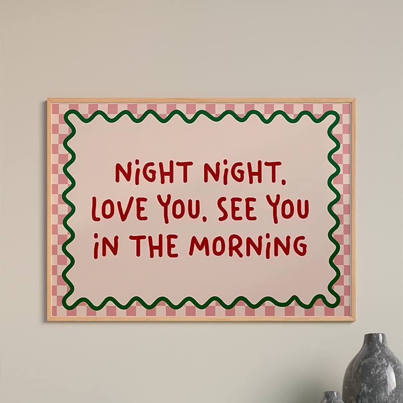 Δημιουργήστε μια ζεστή, χαλαρωτική και στοργική ατμόσφαιρα, ιδανική για το παιδικό ή το βρεφικό δωμάτιο ή ακόμα και το υπνοδωμάτιο, με τον γλυκό πίνακα Tharis. Ο πίνακας αυτός φέρει το τρυφερό μήνυμα "NIGHT NIGHT. LOVE YOU, SEE YOU IN THE MORNING" με μια ευχάριστη, ρετρό γραμματοσειρά.