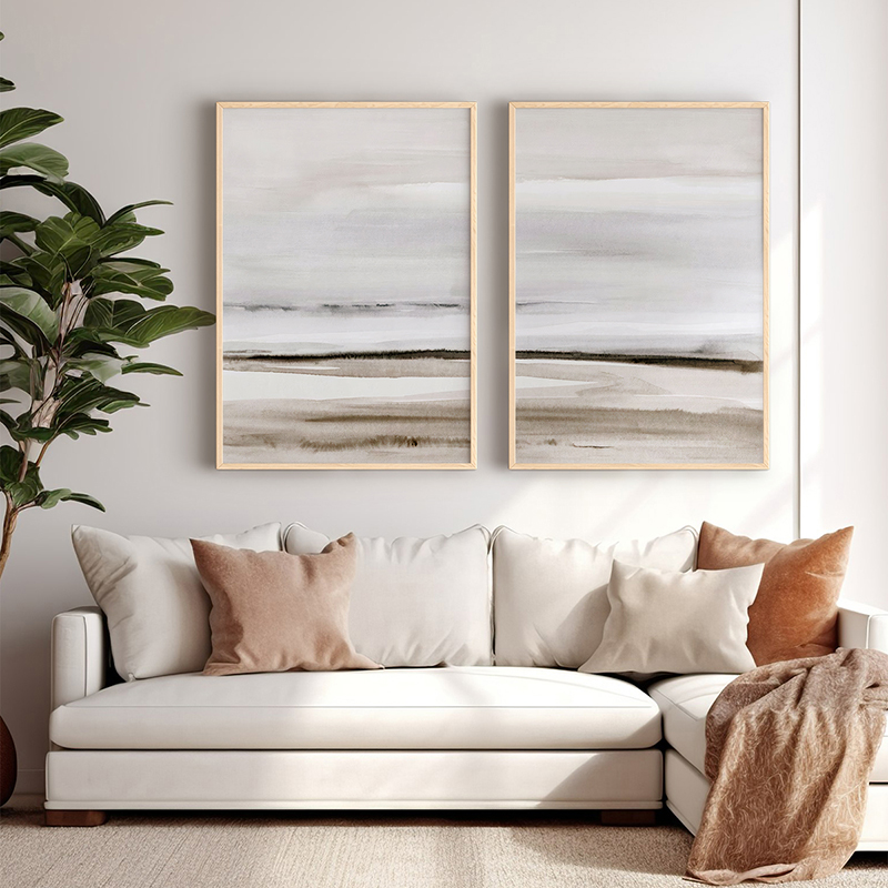 Αφήστε το βλέμμα σας να ηρεμήσει στον ομιχλώδη ορίζοντα και την απόλυτη γαλήνη ενός minimal τοπίου. Το δίπτυχο Vervemy δεν είναι απλώς διακόσμηση, είναι μία αισθητική δήλωση που αναπαριστά την υποβλητική ομορφιά ενός τοπίου, όπου οι γραμμές συναντούν τα αιθέρια χρώματα. Κάθε φορά που εστιάζετε στις απαλές, οριζόντιες γραμμές και τους neutral τόνους, νιώθετε μια αίσθηση βαθιάς ηρεμίας, διαλογισμού και απόλυτης ισορροπίας. Το έργο συμβολίζει την ησυχία, την απλότητα και τη διαχρονική γοητεία του μινιμαλισμού. Είναι η οπτική υπενθύμιση ότι η πολυτέλεια βρίσκεται στη στιγμή της απόλυτης ηρεμίας.
