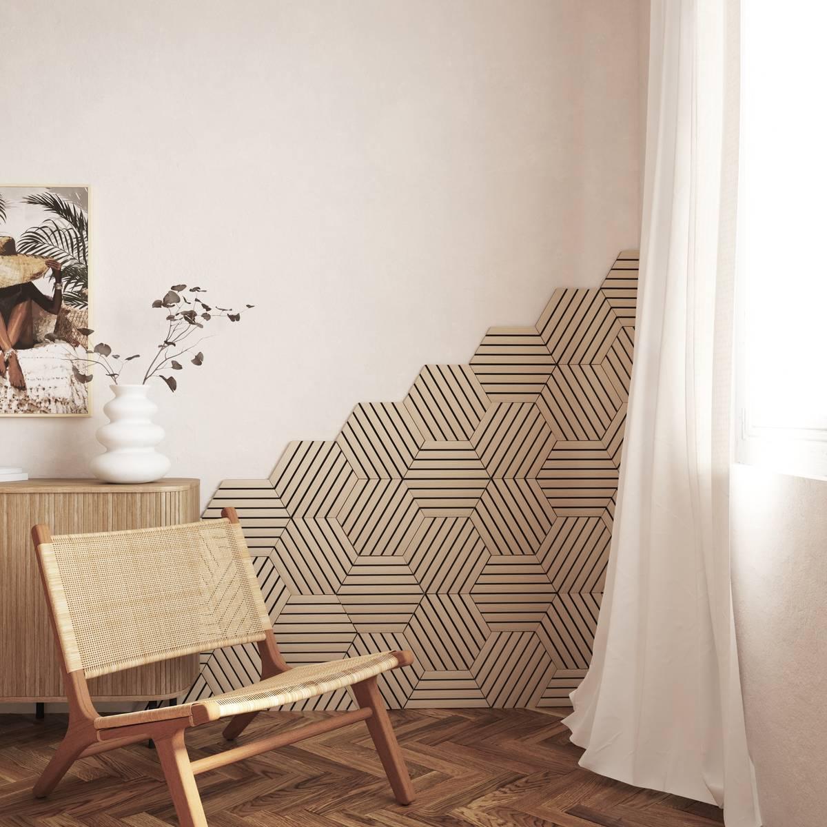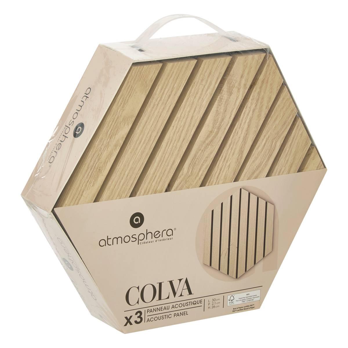 Αυτό το σετ των 3 διακοσμητικών πάνελ Colva χαρακτηρίζεται από το εξαγωνικό του σχήμα. Είναι φτιαγμένα από ξυλοΐνες πιστοποιημένες με FSC® με μπεζ τσόχα και υφή χαρτιού βενίρε με υφή δρυός για μια πολύ φυσική εμφάνιση. Με συνολικό πάχος 2,1 cm, προσφέρουν επίσης ακουστική μόνωση που θα μειώσει την αντήχηση στο δωμάτιό σας. Τα ξύλινα έπιπλα και ένα μεγάλο χαλί Atmosphera θα ενισχύσουν μια άνετη και φιλόξενη ατμόσφαιρα.