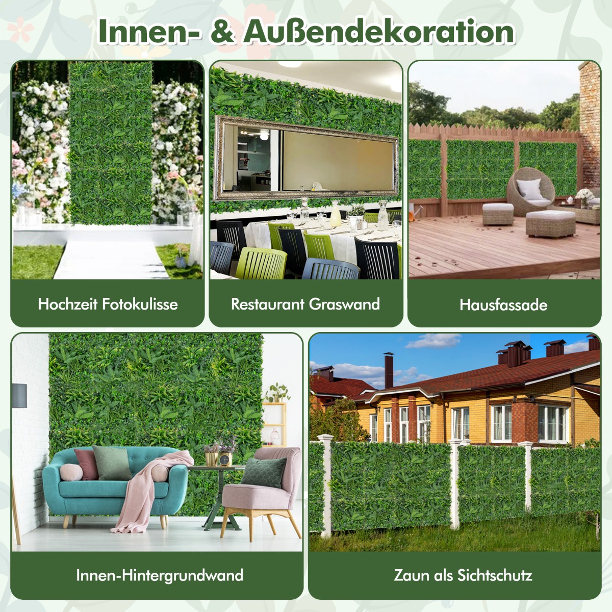 - Διακόσμηση Εσωτερικού και Εξωτερικού Χώρου: Αυτά τα πολυλειτουργικά πάνελ χρησιμεύουν ως φόντο φωτογραφιών γάμου, τοίχος γρασιδιού εστιατορίου, πρόσοψη σπιτιού, τοίχος φόντου εσωτερικού χώρου, φράχτης οθόνης φυτών και άλλα. Ενσωματώνονται απρόσκοπτα στον εσωτερικό ή εξωτερικό σας χώρο για να καλύψουν τις διακοσμητικές και ιδιωτικές σας ανάγκες.