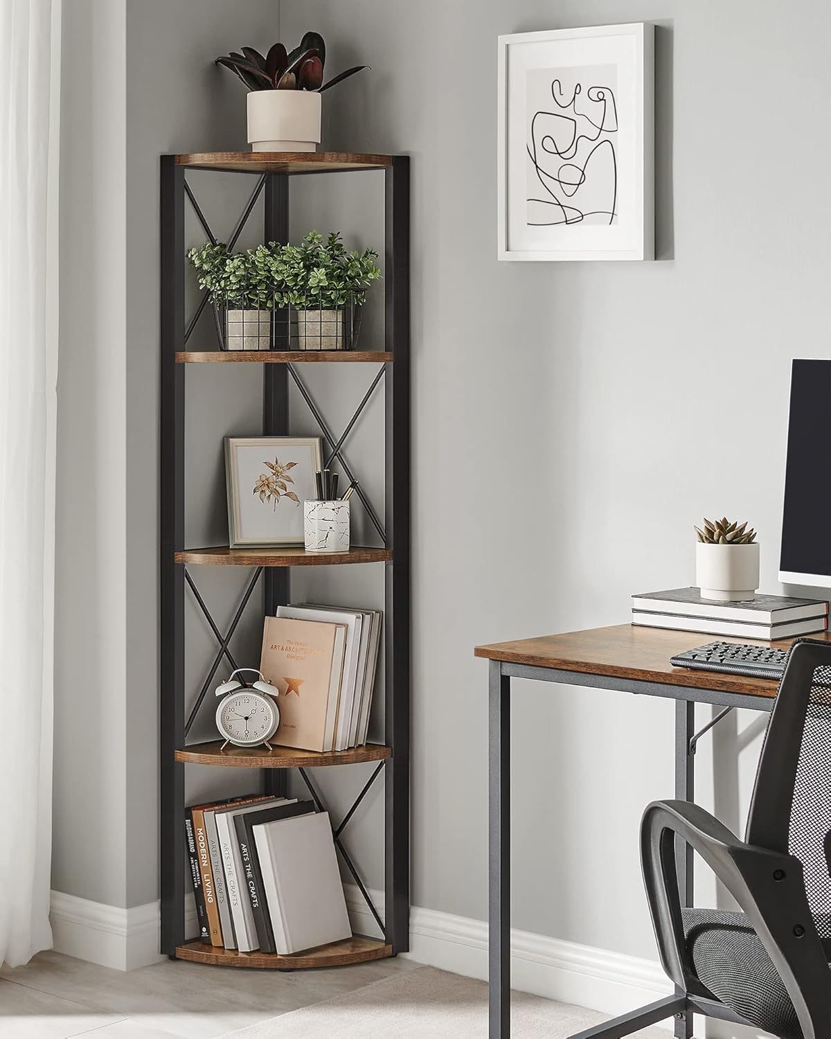 Αξιοποιήστε κάθε γωνία του σπιτιού σας με αυτή τη κομψή και πρακτική γωνιακή ραφιέρα 5 επιπέδων από τη VASAGLE. Συνδυάζει τον βιομηχανικό σχεδιασμό με αποδοτική αποθήκευση και είναι ιδανική για σαλόνι, κουζίνα, μπάνιο ή χολ.