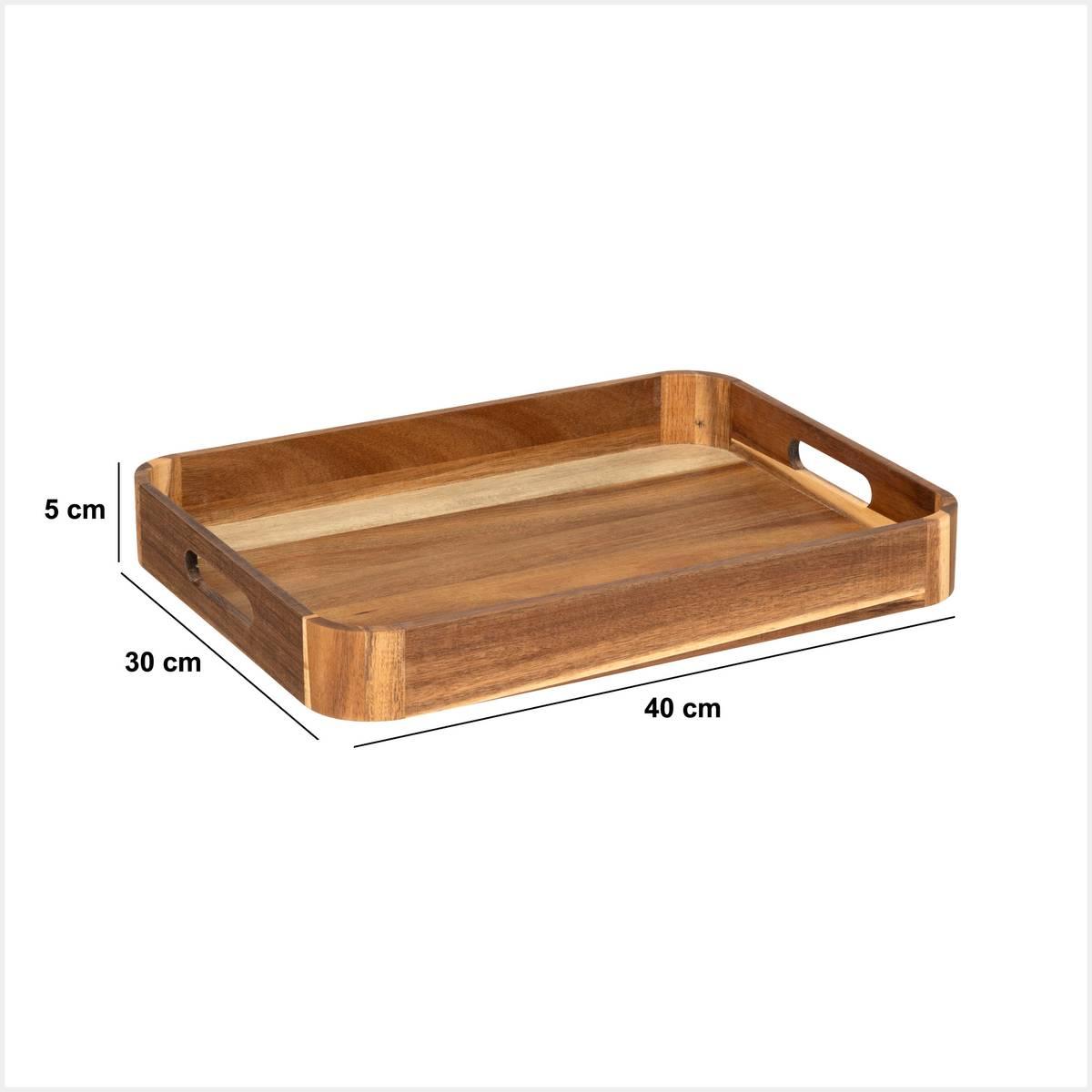 Κατασκευασμένος από κορυφαίας ποιότητας ξύλο ακακίας, προσφέρει υπέροχο φυσικό νεράκι και ζεστή απόχρωση που αναβαθμίζει την αισθητική κάθε τραπεζιού. Οι ενσωματωμένες πλαϊνές λαβές του δίσκου επιτρέπουν την άνετη και κομψή μεταφορά ποτών, σνακ ή πρωινού στο κρεβάτι. Συνδυάζοντας πρακτικότητα με διακοσμητική αξία, είναι ιδανικός για καθημερινή χρήση ή ειδικές περιστάσεις σε σπίτια, καφέ ή εστιατόρια.