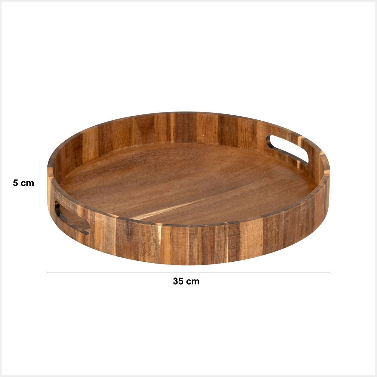 Σερβίρετε με στυλ με αυτό το κομψό Στρογγυλό Δίσκο από Ξύλο Ακακίας Ø35 cm, κατασκευασμένο από υψηλής ποιότητας ξύλο ακακίας για μια ζεστή, φυσική εμφάνιση. Η λεία επιφάνειά του και οι ενσωματωμένες πλαϊνές λαβές διευκολύνουν τη μεταφορά ποτών, σνακ ή πρωινού στο κρεβάτι. Με ανθεκτικό και ισχυρό σχεδιασμό, ο δίσκος αυτός δεν είναι μόνο ιδανικός για καθημερινή χρήση στο σπίτι, αλλά και για επαγγελματικά περιβάλλοντα όπως καφετέριες, ξενοδοχεία και εστιατόρια. Ως μέρος της συλλογής 5Five, προσθέτει μια πινελιά αγροτικής γοητείας και λειτουργικότητας σε κάθε χώρο.