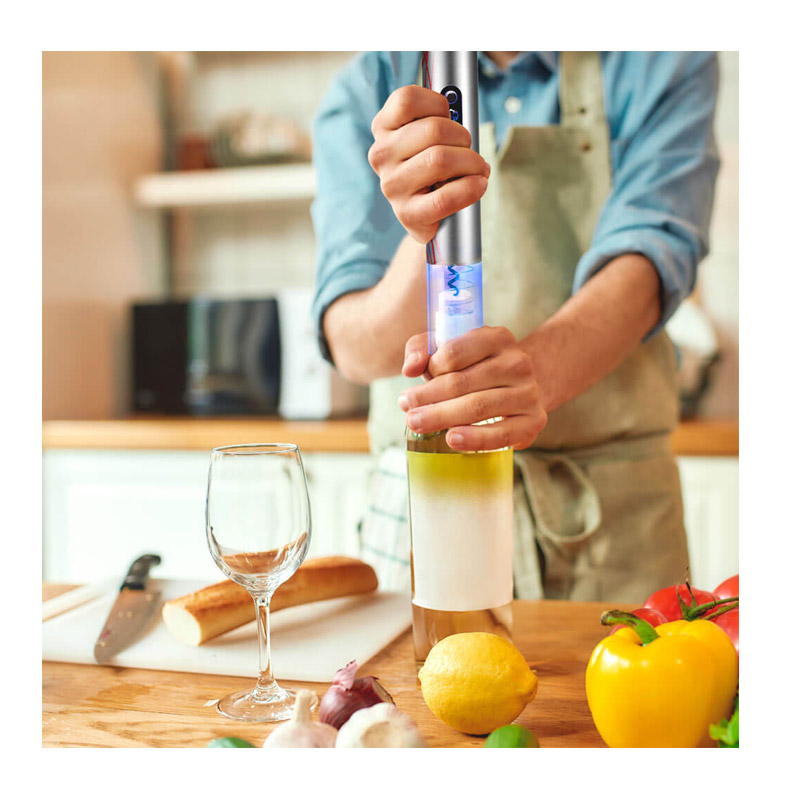 Το ηλεκτρικό ανοιχτήρι, διαθέτει κόπτη για να κάνετε μια ακριβή και καθαρή τομή κάτω από το λαιμό και να αποφύγετε τη μόλυνση του κρασιού με υπολείμματα της κάψουλας και ένα δαχτυλίδι κατά του σταξίματος, το οποίο εισάγεται στο λαιμό του μπουκαλιού και σταματά τη ροή του κρασιού.