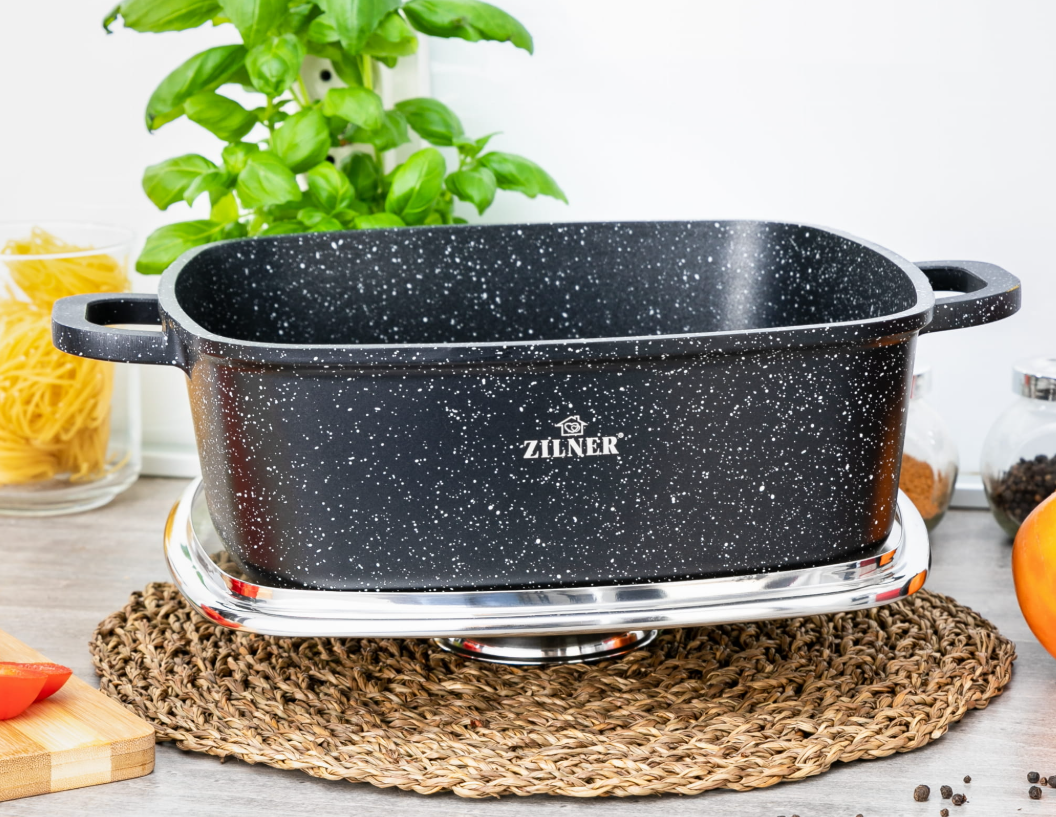Η τετράγωνη γάστρα ZILNER ZL-7003 με μαρμάρινη αντικολλητική επίστρωση είναι κατάλληλη για όλους τους τύπους κουζινών - αλογόνου, κεραμικής, αερίου και επαγωγικής.