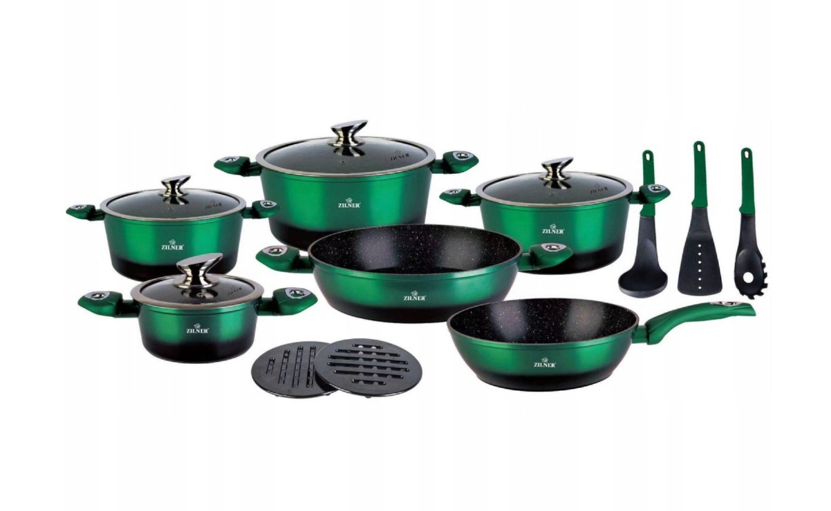 Το σετ, από την εταιρεία Zilner, αποτελείται από 4 κατσαρόλες, ένα βαθύ τηγάνι, ένα τηγάνι Wok τα οποία διαθέτουν σώμα από χυτό κράμα αλουμινίου με εξαιρετικές θερμοαγώγιμες ιδιότητες και επίστρωση γρανιτένια, αντικολλητική, χωρίς επιβλαβείς ουσίες PFOA. 'Εχουν, επίσης, υψηλή αντοχή στις γρατσουνιές και στη θερμοκρασία και λαβές με επίστρωση σιλικόνης.