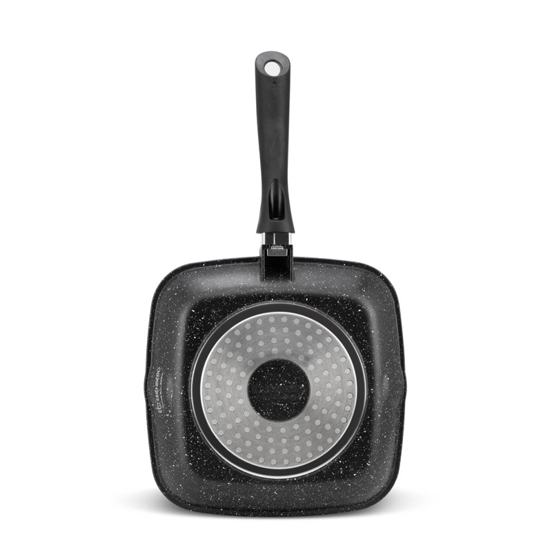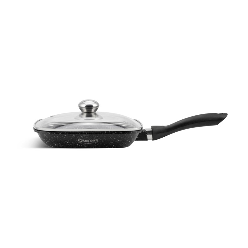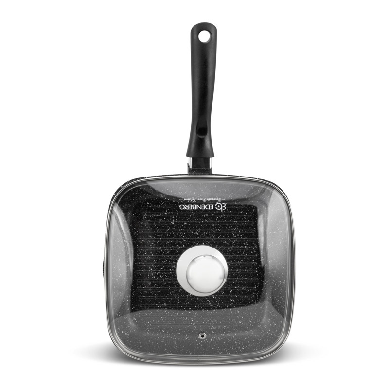 Το τηγάνι - γκριλ, από την εταιρία Edenberg, είναι κατασκευασμένο από συμπιεσμένο αλουμίνιο και διαθέτει αντικολλητική κεραμική μαρμάρινη επίστρωση, χωρίς PFOA. Το τηγάνι - γκριλ έχει γυάλινο καπάκι με οπή απελευθέρωσης του ατμού, διάμετρο 24 cm, είναι κατάλληλο για όλες τις εστίες και πλένεται εύκολα.