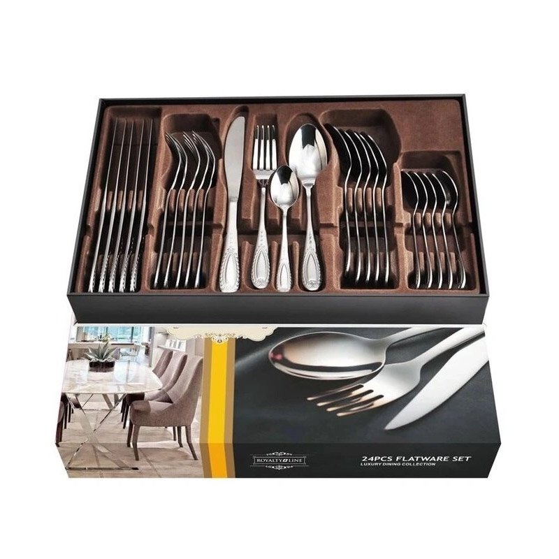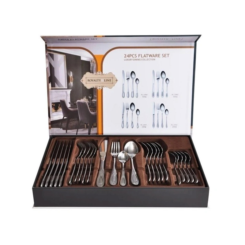 Το σετ, από την εταιρία Royalty Line, περιλαμβάνει 24 μαχαιροπίρουνα από ανοξείδωτο ατσάλι με γυαλιστερό φινίρισμα. Τα μαχαιροπίρουνα είναι κατάλληλα για καθημερινή χρήση και πλένονται στο πλυντήριο πιάτων.