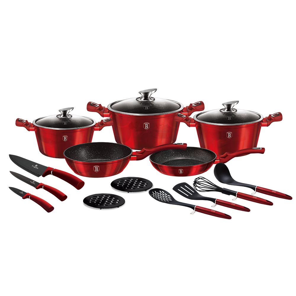Σετ μαγειρικά σκεύη 17 τεμαχίων με τριπλή μαρμάρινη επίστρωση Burgundy Metallic Line, Berlinger Haus BH-6162