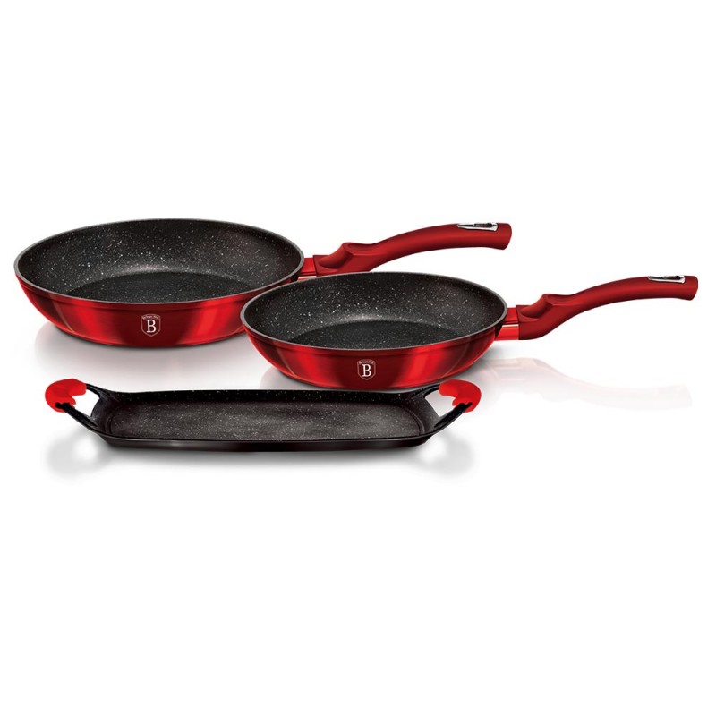 Σετ 2 τηγάνια με τριπλή μαρμάρινη επίστρωση και Αντικολλητική Πλάκα Ψησίματος, Metallic Line Burgundy Edition, Berlinger Haus BH-1668