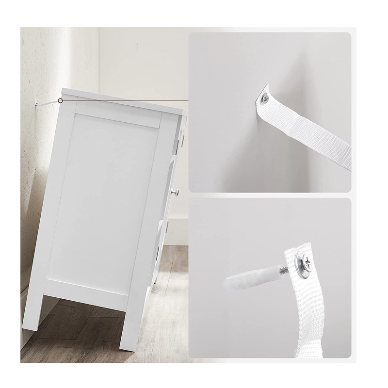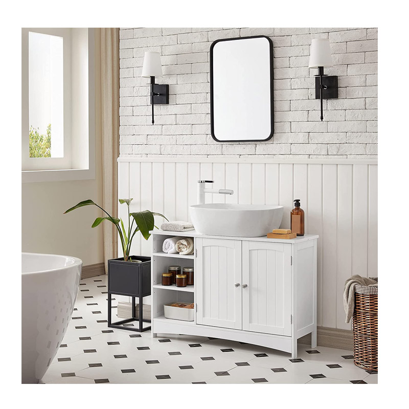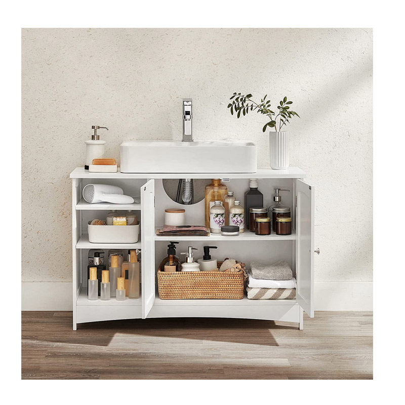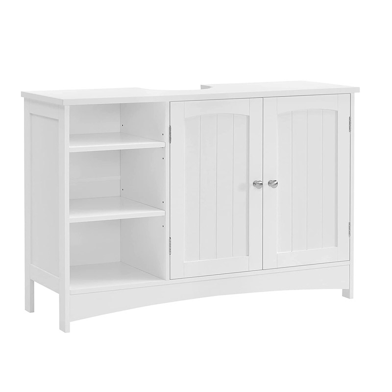 Το ντουλάπι, από την εταιρία VASAGLE, είναι κατασκευασμένο από υψηλής ποιότητας σανίδες MDF, με λεία επιφάνεια. Το λευκό χρώμα, οι πόρτες με ειδικές αυλακώσεις και οι επιχρωμιωμένες μεταλλικές λαβές, δίνουν στο ντουλάπι μια ξεχωριστή εμφάνιση. Αριστερά υπάρχει ένα ανοιχτό ράφι, το οποίο είναι εξοπλισμένο με δύο ρυθμιζόμενα ράφια 3 επιπέδων. Στο εσωτερικό του ντουλαπιού, υπάρχει ένα ρυθμιζόμενο ράφι 3 επιπέδων. Χάρη στην κοπή σε σχήμα U, μπορεί να τοποθετηθεί εύκολα γύρω από το νεροχύτη και τους σωλήνες.