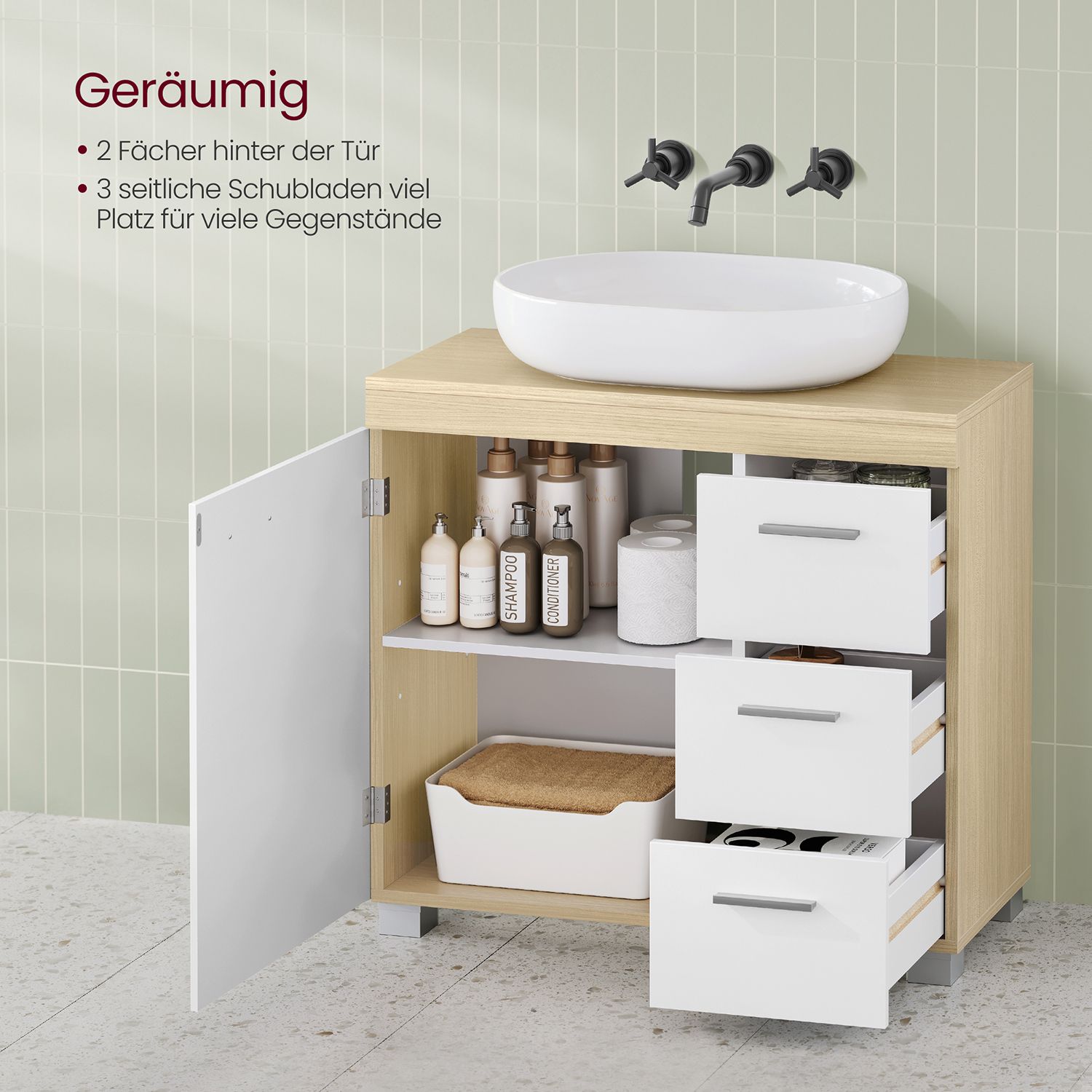 Ρυθμιζόμενο Ράφι & Πρακτικά Χερούλια: Το ράφι στο ντουλάπι είναι ρυθμιζόμενο σε 3 επίπεδα, επιτρέποντας την αποθήκευση μπουκαλιών σαμπουάν και αφρόλουτρου διαφορετικών μεγεθών. Η πόρτα και τα συρτάρια ανοίγουν εύκολα χάρη στα χερούλια.