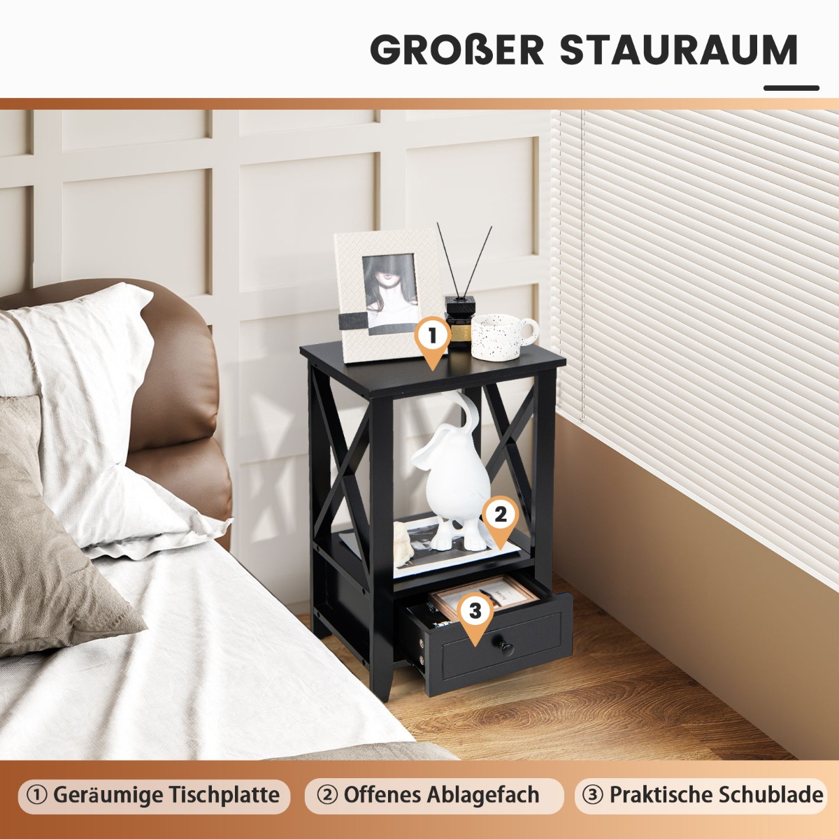 Αναβαθμίστε το υπνοδωμάτιό σας με το μοντέρνο κομοδίνο μας σε σχέδιο Χ! Αυτό το συμπαγές τραπέζι προσφέρει άφθονο αποθηκευτικό χώρο και μπορεί να χρησιμοποιηθεί ως κομοδίνο, βοηθητικό τραπέζι, ντουλάπι αποθήκευσης κ.λπ. στο σπίτι σας. Η ευρύχωρη επιφάνεια και το ανοιχτό ράφι είναι ιδανικά για την αποθήκευση ή την προβολή των φλιτζανιών, των κορνιζών, των βιβλίων, των κουτιών αποθήκευσης, των διακοσμητικών και άλλων. Επιπλέον, το κάτω συρτάρι προσφέρει κρυφό αποθηκευτικό χώρο για τα προσωπικά σας αντικείμενα και τα προστατεύει από τη σκόνη. Μπορείτε να τραβήξετε εύκολα το συρτάρι με τη βοήθεια του πρακτικού κουμπιού και των ομαλών οδηγών. Αυτό το βοηθητικό τραπέζι από υψηλής ποιότητας MDF είναι εξαιρετικά ανθεκτικό και μακράς διαρκείας. Επιπλέον, αυτό το κομοδίνο διαθέτει δομή σε σχήμα Χ, αντιολισθητικά μαξιλαράκια ποδιών και αντιστρεπτική ασφάλεια για μεγαλύτερη σταθερότητα και ασφάλεια. Με μοντέρνο και απλό σχεδιασμό, αυτό το βοηθητικό τραπέζι ταιριάζει καλά με κάθε διακόσμηση και προσθέτει μια αίσθηση λεπτότητας στο δωμάτιό σας.