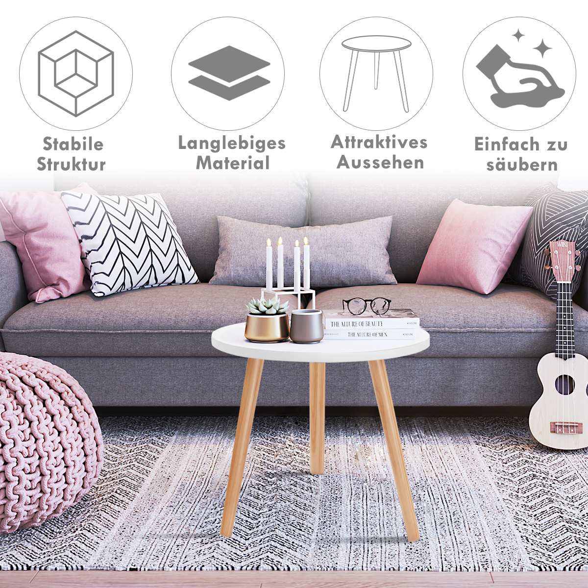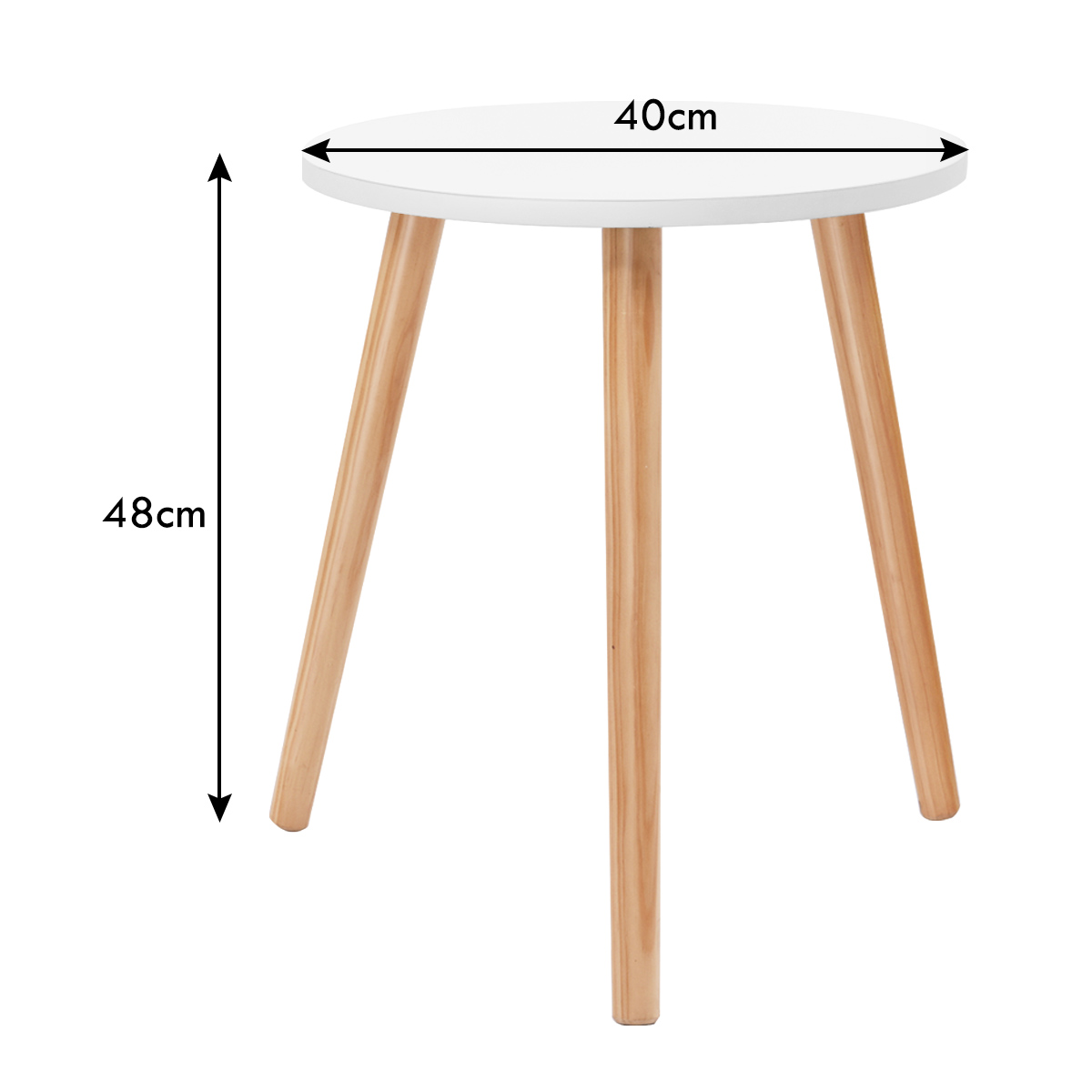 Ο στρογγυλός βοηθητικός μας τραπέζι, με την μινιμαλιστική και κομψή του εμφάνιση, είναι το ιδανικό έπιπλο που ταιριάζει σε κάθε χώρο. Το μέγεθος και το ύψος του το καθιστούν ιδανικό για χρήση δίπλα σε καρέκλα, καναπέ, κομοδίνο, τόσο σε εσωτερικούς όσο και εξωτερικούς χώρους. Με την λευκή, στρογγυλή και υψηλής ποιότητας επιφάνεια από MDF και τα πόδια από ξύλο πεύκου, είναι ανθεκτικό και στιβαρό. Η ανθεκτική στην φθορά επιφάνεια καθιστά εύκολο τον καθαρισμό του. Απολαύστε οικογενειακά άλμπουμ, περιοδικά ή αγαπημένα βιβλία, θαυμάστε διακοσμητικές πινελιές και απολαύστε έναν καφέ ή ένα ποτήρι κρασί. Χρησιμοποιήστε το στο σπίτι, οποιαδήποτε στιγμή και οπουδήποτε.