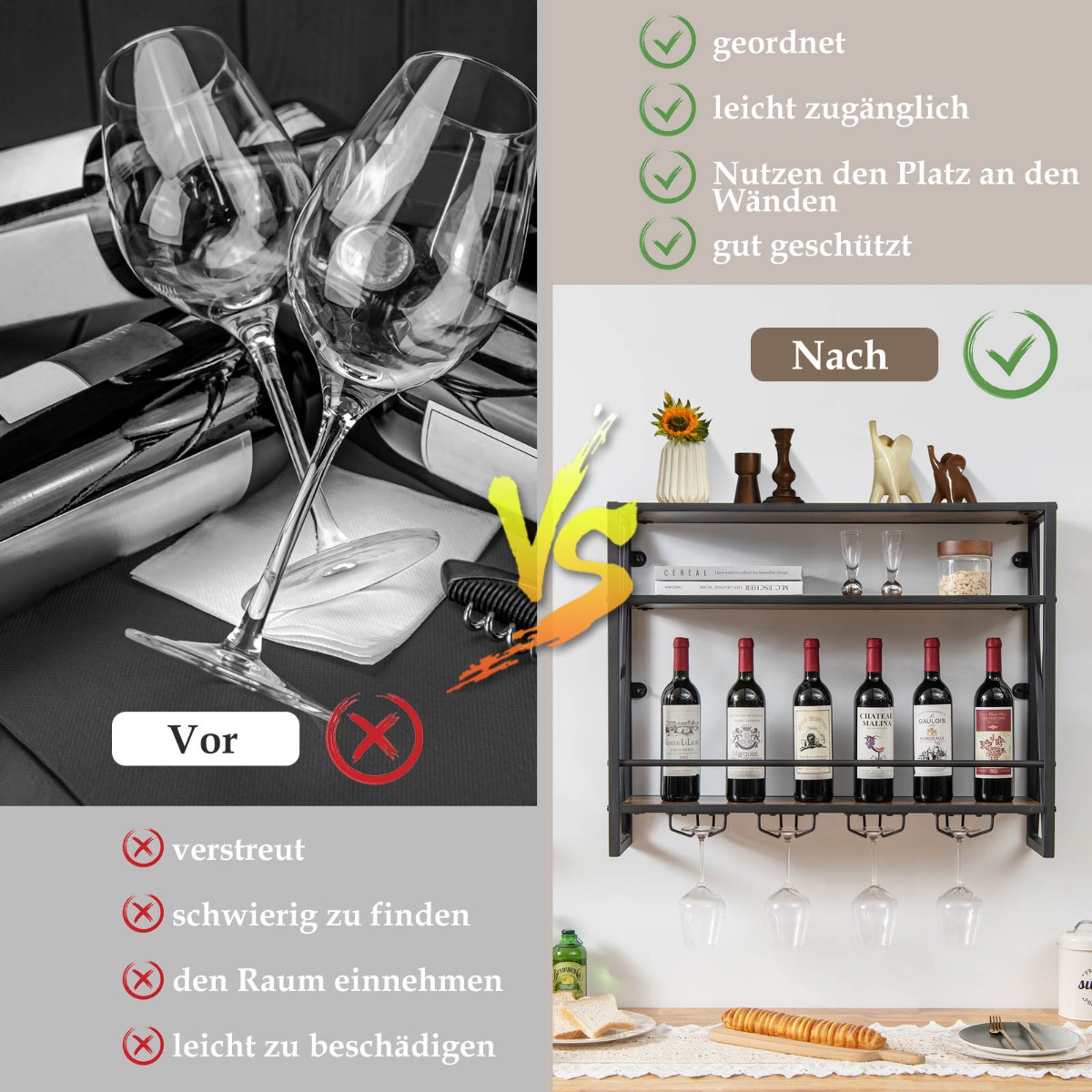 Σχεδιασμός Εξοικονόμησης ΧώρουΤο κρεμαστό ράφι κρασιού τοίχου μεγιστοποιεί τον τοίχο χωρίς να επηρεάζει το δάπεδο, καθιστώντας το ιδανικό για κάθε χώρο του σπιτιού, όπως το σαλόνι, την τραπεζαρία ή την κουζίνα.