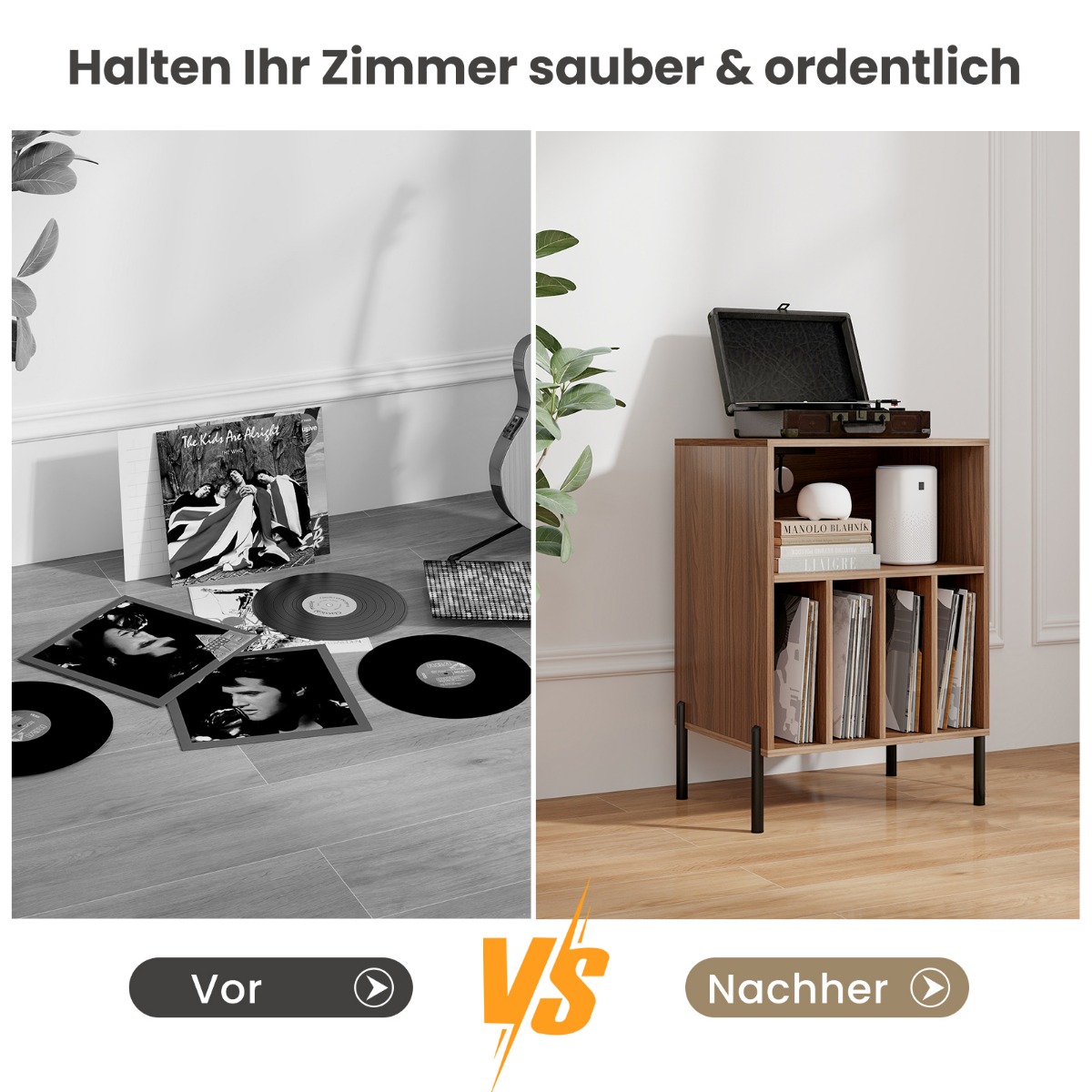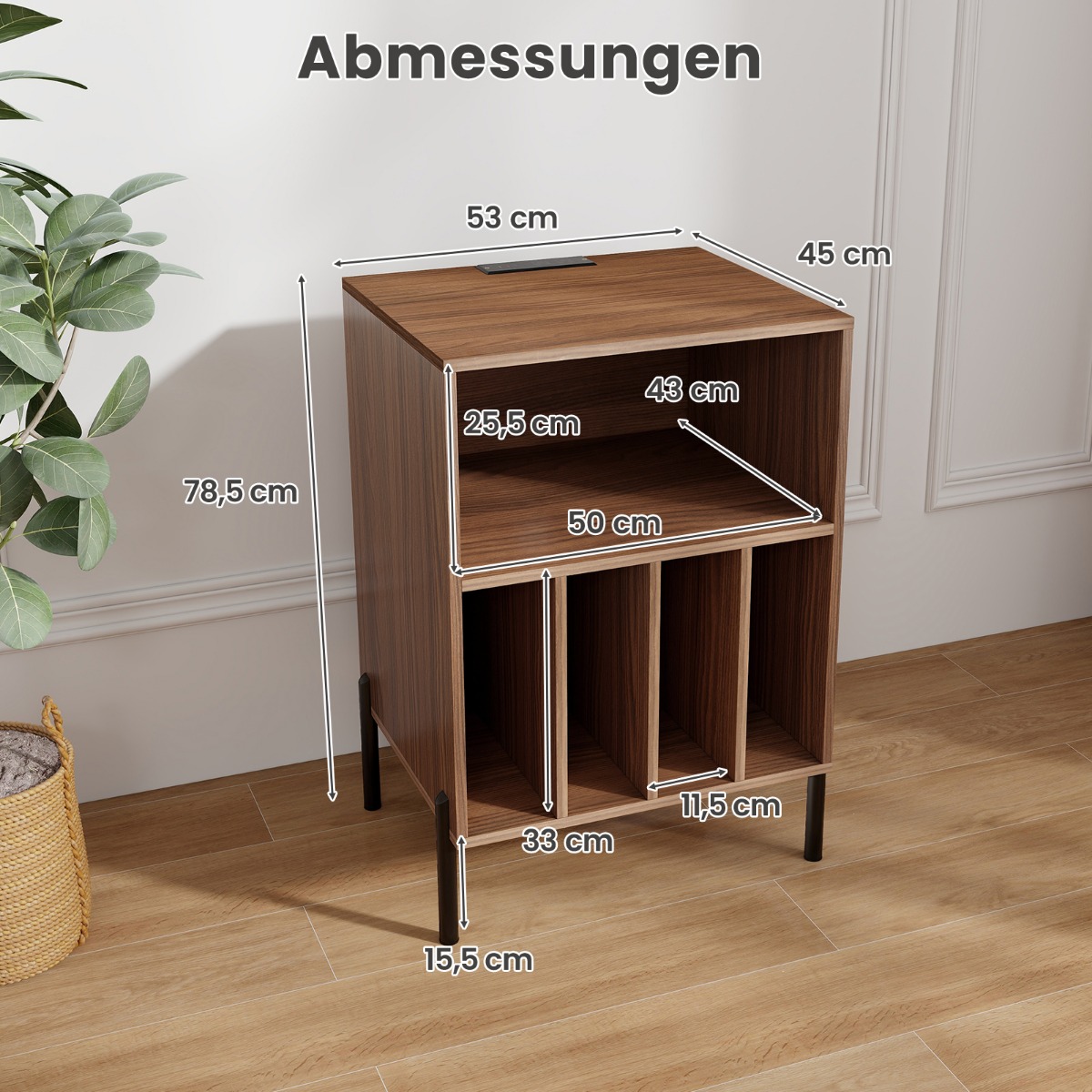 - Χωράει έως και 150 δίσκους βινυλίου, ενώ μπορεί να χρησιμοποιηθεί και ως κομοδίνο ή βοηθητικό τραπέζι.