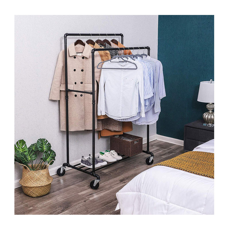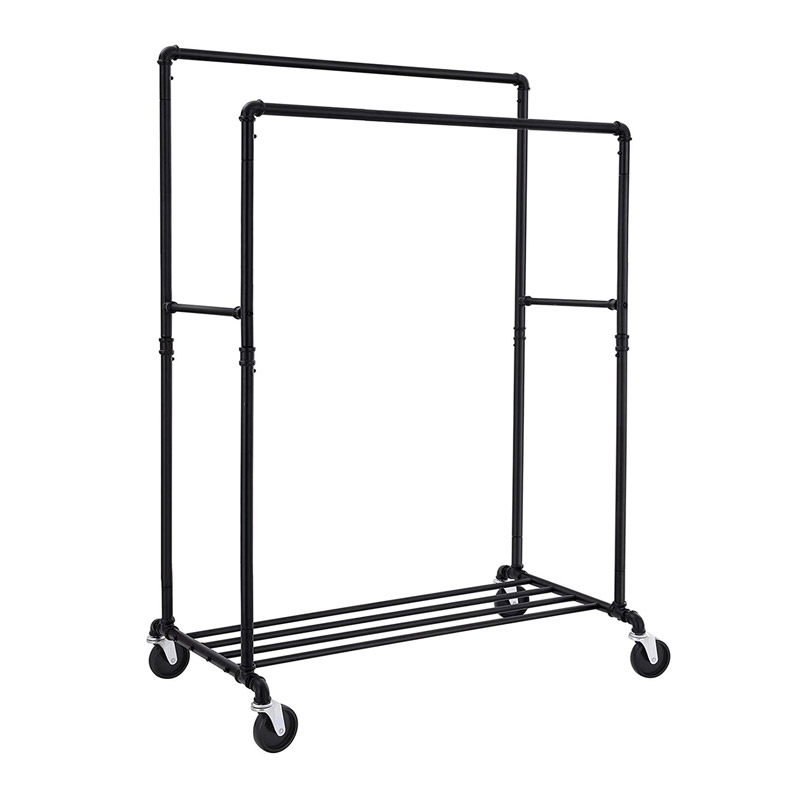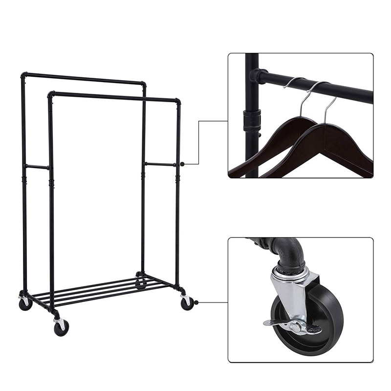 Η κρεμάστρα, είναι εξοπλισμένη με 2 ράγες, επιπρόσθετο ράφι στο κάτω μέρος για παπούτσια και 4 πλαστικές και περιστρεφόμενες ρόδες 360° με φρένα ασφάλισης για εύκολη μετακίνηση.