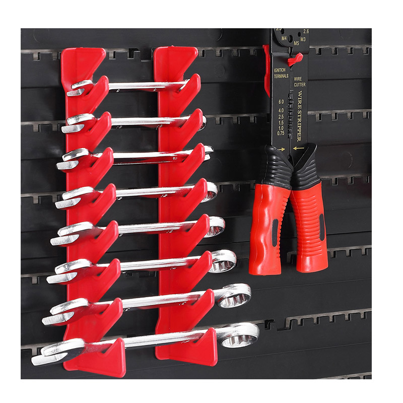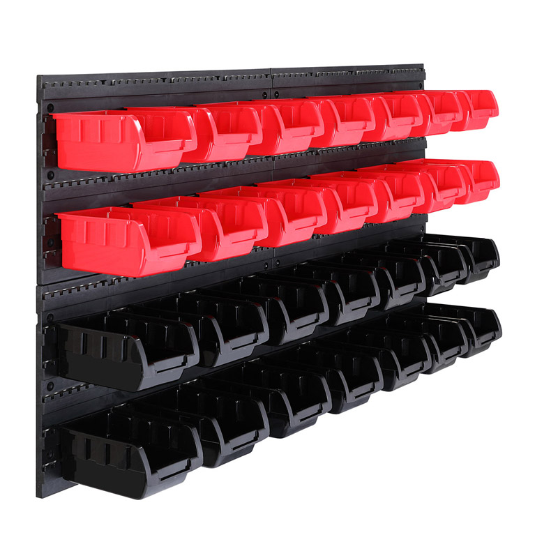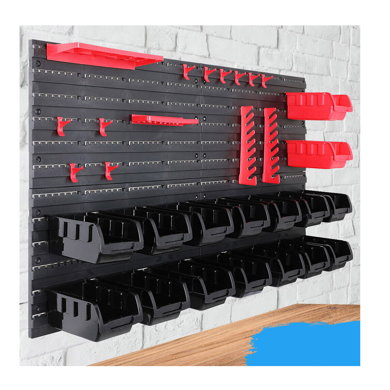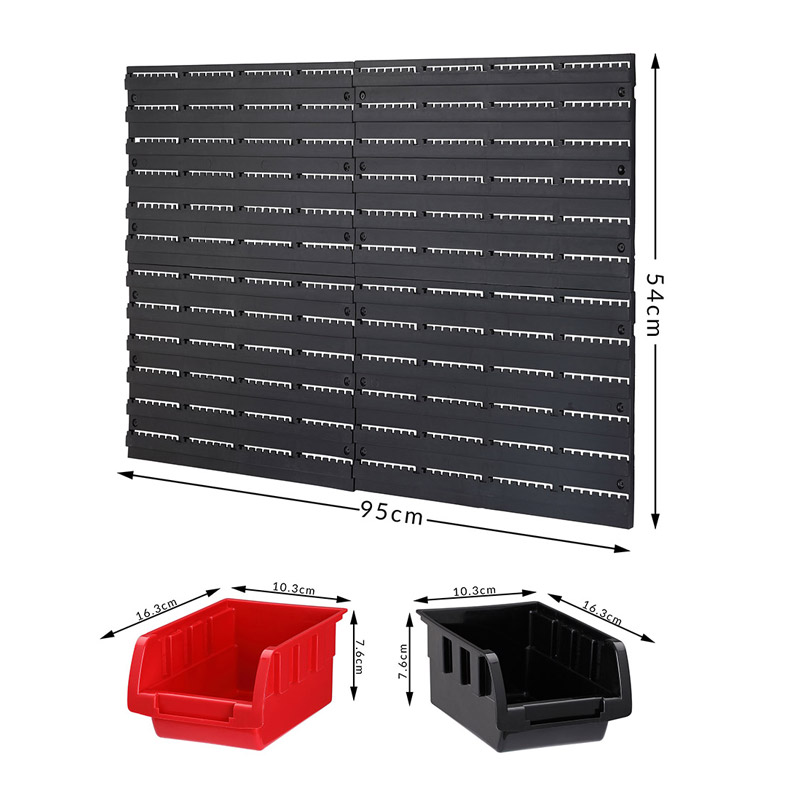 Κάθε δοχείο και κάθε βάση εργαλείων είναι αφαιρούμενα και τα δοχεία για μικρά εξαρτήματα μπορούν να στοιβάζονται το ένα πάνω στο άλλο. Τα πάνελ και όλο το σετ είναι κατασκευασμένα εξολοκλήρου από πολυπροπυλένιο, ένα ανθεκτικό και υψηλής ποιότητας πλαστικό υλικό σε κόκκινο και μαύρο χρώμα. Τα πάνελ, τοποθετούνται εύκολα στον τοίχο και είναι επίσης επεκτάσιμα. Με αυτόν τον τρόπο, μπορείτε να μεγεθύνετε το πάνελ προσαρμόζοντάς το όλο και περισσότερο.