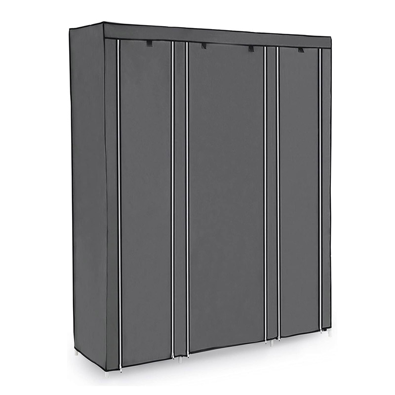Η ντουλάπα έχει υφασμάτινο κάλυμμα ώστε να προφυλάσσει τα ρούχα σας από τη σκόνη, ενώ τα 3 μπροστινά μισά τμήματα, τα οποία σχηματίζουν την πόρτα, μπορούν να κλείσουν με τη βοήθεια ενός ενσωματωμένου φερμουάρ ή μεταβλητά προς τα πάνω, τυλιγμένα και στερεωμένα.
