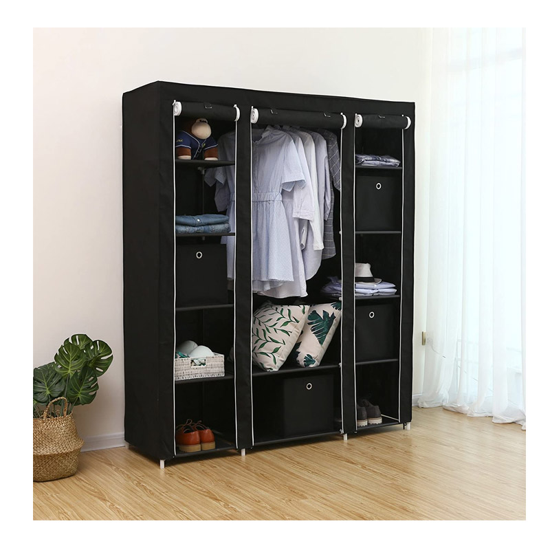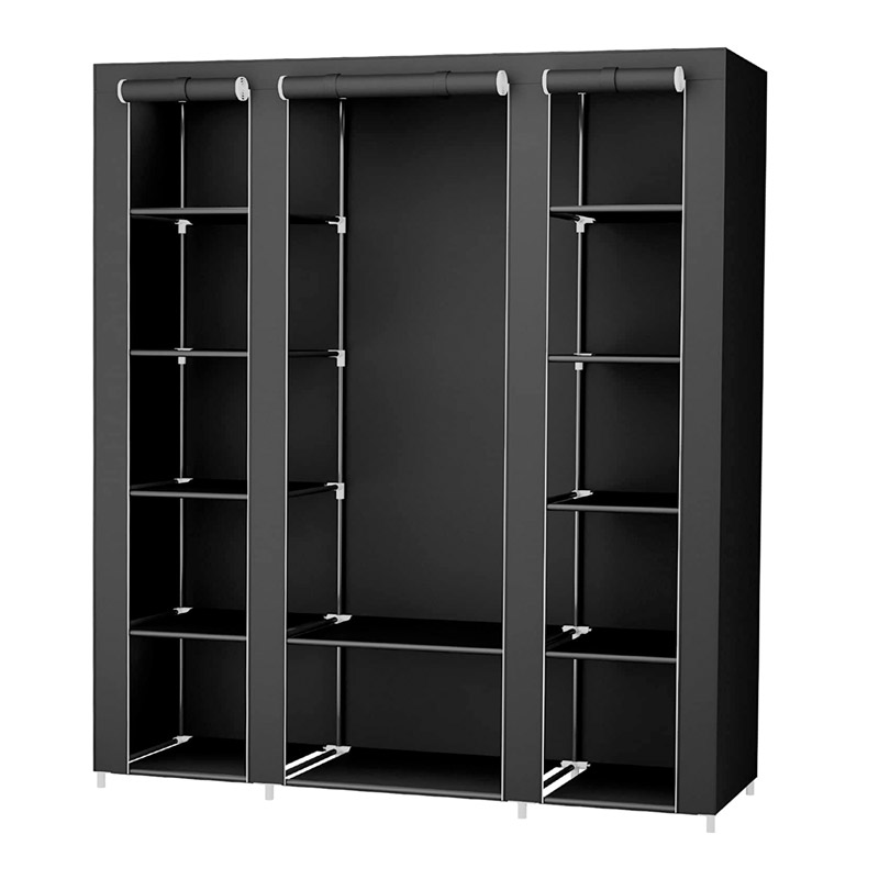 Η ντουλάπα έχει υφασμάτινο κάλυμμα ώστε να προφυλάσσει τα ρούχα σας από τη σκόνη, ενώ τα 3 μπροστινά μισά τμήματα, τα οποία σχηματίζουν την πόρτα, μπορούν να κλείσουν με τη βοήθεια ενός ενσωματωμένου φερμουάρ ή μεταβλητά προς τα πάνω, τυλιγμένα και στερεωμένα.