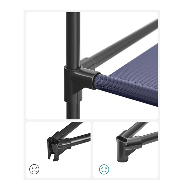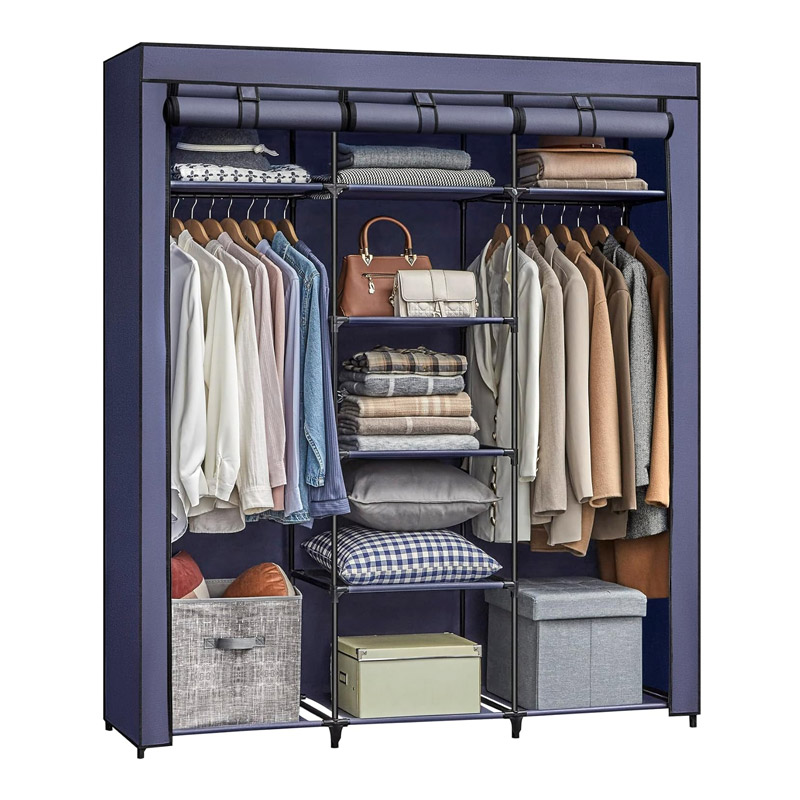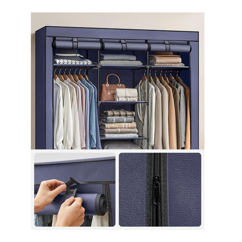 Η ντουλάπα, από την εταιρία Songmics, διαθέτει μεταλλικό σκελετό, αδιάβροχο και εξαιρετικά ανθεκτικό στη σκουριά και τις χρήσεις. Έχει κομψό σχεδιασμό και υφασμάτινο κάλυμμα ώστε να προφυλάσσει τα ρούχα σας από τη σκόνη. Αποτελείται από 7 συνολικά ράφια και 2 ράγες για κρεμάστρες με αρκετό χώρο στο κάτω μέρος στο οποίο μπορείτε να βάλετε παπούτσια, κουτιά αποθήκευσης ή ακόμη και τσάντες.