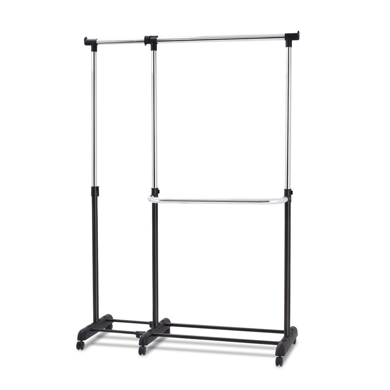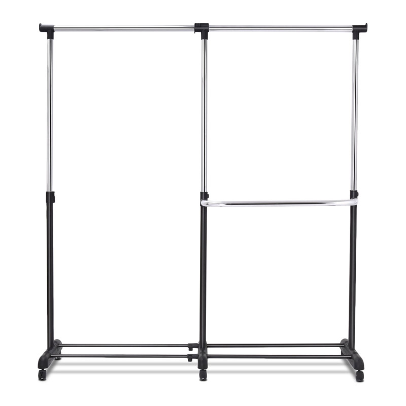 Η κρεμάστρα, διαθέτει σχεδιασμό διπλής ράβδου σε διαφορετικά ύψη, προσφέροντας έτσι περισσότερο χώρο για να ταξινομήσετε και να στεγνώσετε τα ρούχα. Υπάρχει επίσης ένα χαμηλότερο ράφι για επιπλέον χώρο αποθήκευσης. Διαθέτει ρυθμιζόμενο ύψος από 91-160 cm, ενώ το μήκος αριστερά είναι ρυθμιζόμενο από 93-168 cm. Ιδανική για το υπνοδωμάτιο, με εύκολη συναρμολόγηση και μοντέρνο σχεδιασμό.