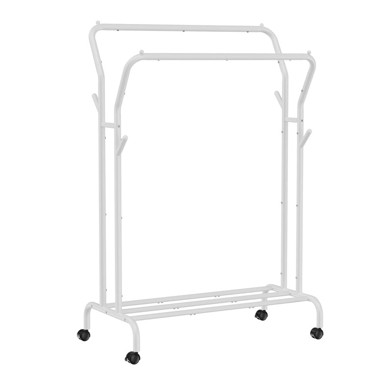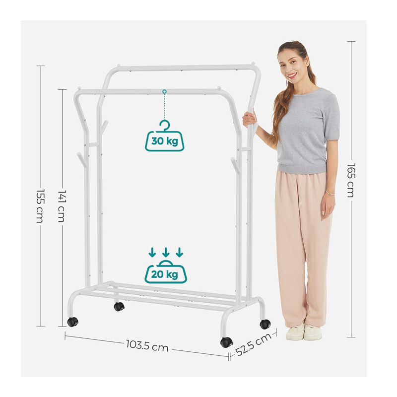 Με ψηλή ράγα και χαμηλή ράγα για να κρεμάτε ρούχα διαφορετικού μήκους, γάντζους και στις δύο πλευρές για τσάντες και καπέλα και κάτω ράφι για κουτιά και παπούτσια. Χάρη στους 4 περιστρεφόμενους τροχούς (2 από τους οποίους κλειδώνουν), ώστε να μπορείτε να την μετακινείτε με ευκολία. Η απόσταση 42 cm μεταξύ στις 2 ράγες επιτρέπει στον αέρα να ρέει εύκολα, προάγοντας το γρήγορο στέγνωμα. Προσφέρει άφθονο χώρο ανάρτησης για την αποφυγή συνωστισμού, ακατάστατων ρούχων, διευκολύνοντας την πρόσβαση σε αυτά.