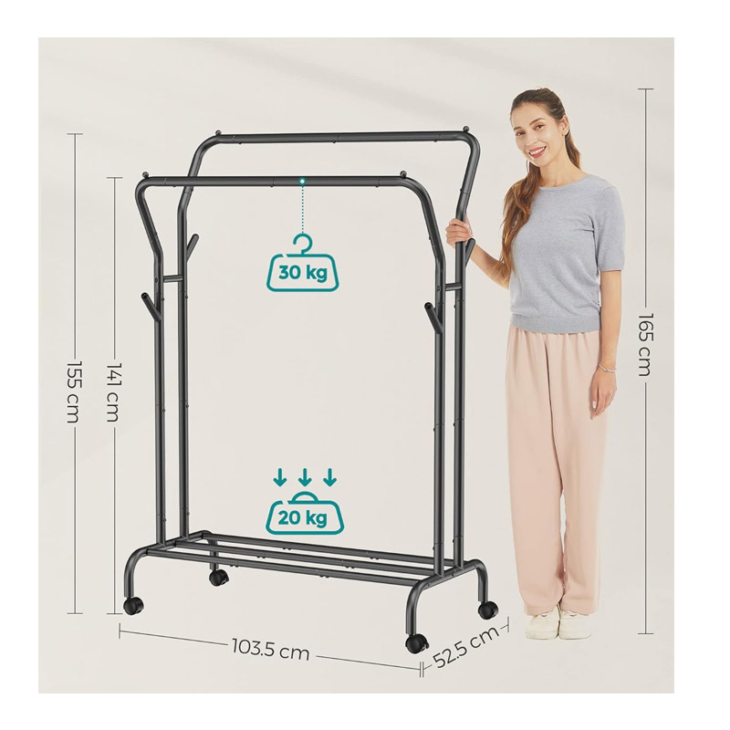 Μεταλλική Διπλή Τροχήλατη Κρεμάστρα Ρούχων Δαπέδου Βαρέως Τύπου 103.5 x 52.5 x 155 cm Χρώματος Μαύρο Songmics HSR107B01