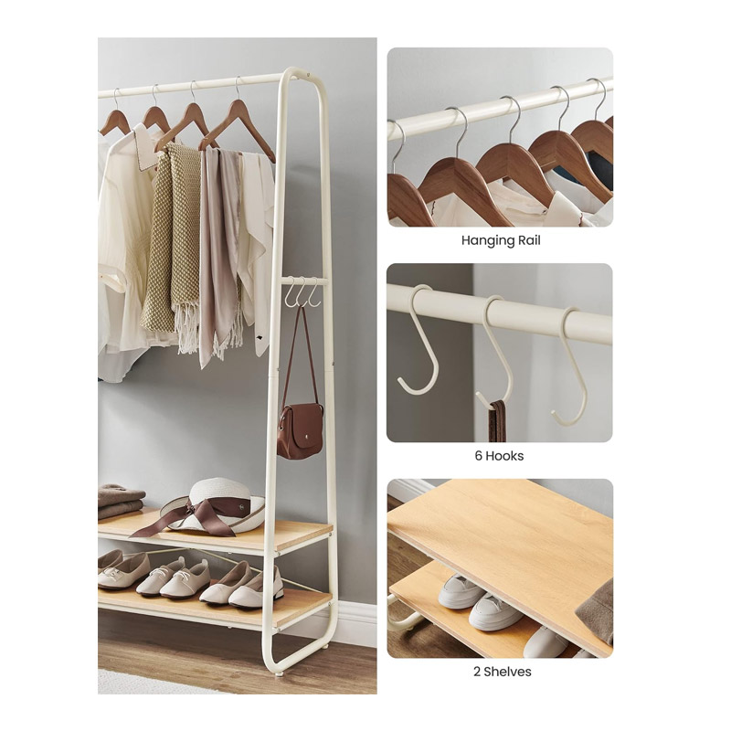 Η κρεμάστρα ρούχων δαπέδου, από την εταιρία VASAGLE, διαθέτει μεταλλικό σκελετό από ατσάλι και 2 ξύλινα ράφια από μοριοσανίδα, προσφέροντας άφθονο χώρο για να οργανώσετε τα ρούχα σας. Επιπλέον, είναι εξοπλισμένη με πλαϊνούς γάντζους σε σχήμα S για να κρεμάτε διάφορα αξεσουάρ.