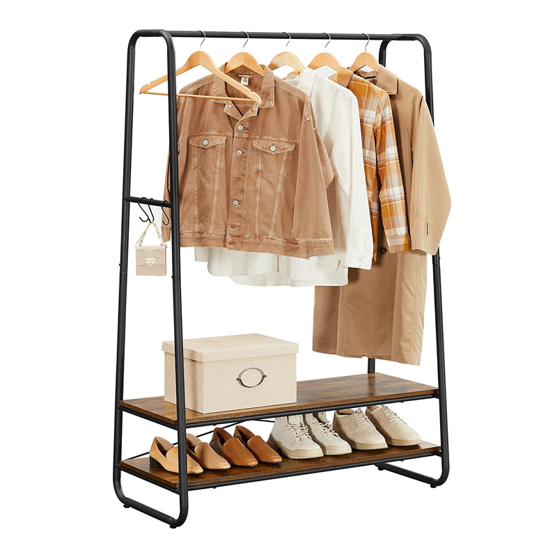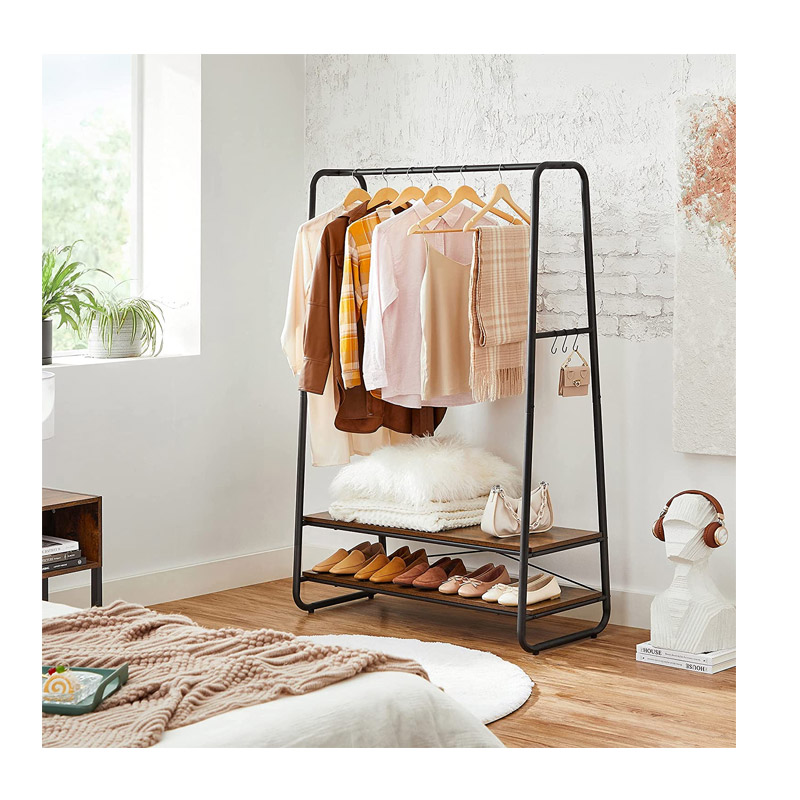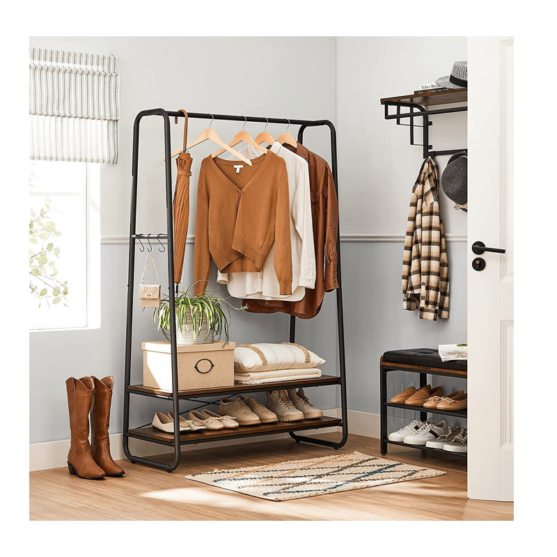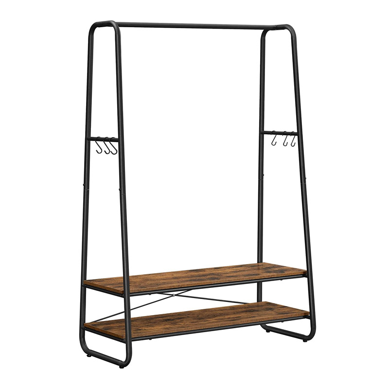 Η κρεμάστρα ρούχων δαπέδου, από την εταιρία VASAGLE, διαθέτει μεταλλικό σκελετό από ατσάλι και 2 ξύλινα ράφια από μοριοσανίδα, προσφέροντας άφθονο χώρο για να οργανώσετε τα ρούχα σας. Επιπλέον, είναι εξοπλισμένη με πλαϊνούς γάντζους σε σχήμα S για να κρεμάτε διάφορα αξεσουάρ.