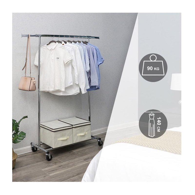 Η κρεμάστρα, στο πάνω μέρος, διαθέτει 2 επεκτάσιμα άκρα (κάθε πλευρά 0-20 cm) και είναι εξοπλισμένη με 4 βιομηχανικές και περιστρεφόμενες ρόδες 360°, κατασκευασμένες απο ποιοτικό υλικό, με φρένα ασφάλισης για εύκολη μετακίνηση.