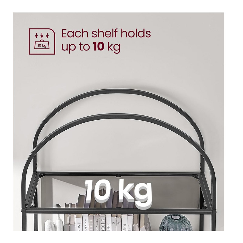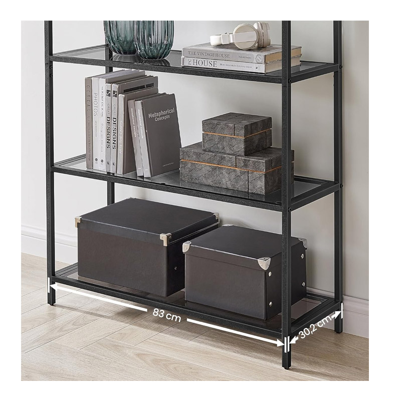 Η ραφιέρα, από την εταιρία VASAGLE, διαθέτει ατσάλινο σκελετό και 5 ράφια από σκληρυμένο γυαλί πάχους 5 mm με αντιολισθητικά μαξιλαράκια μπορούν να χωρέσουν σταθερά 10 Kg το καθένα. Τα ρυθμιζόμενα πόδια κρατούν την ισορροπημένη και η προστασία από την ανατροπή προσφέρει πρόσθετη σταθερότητα.