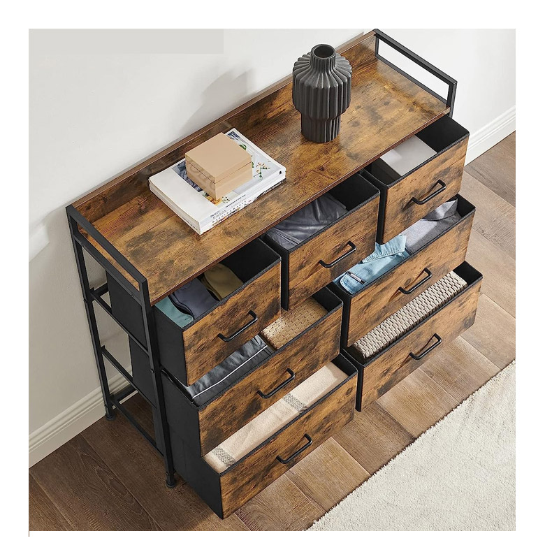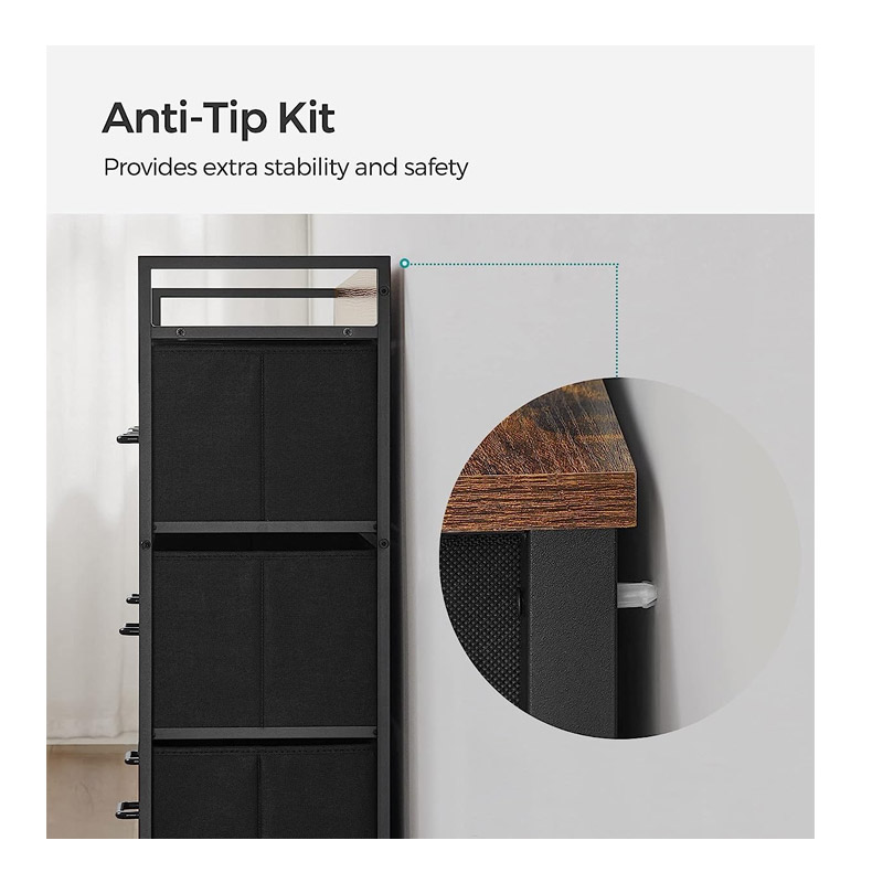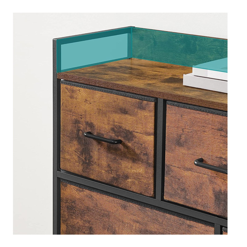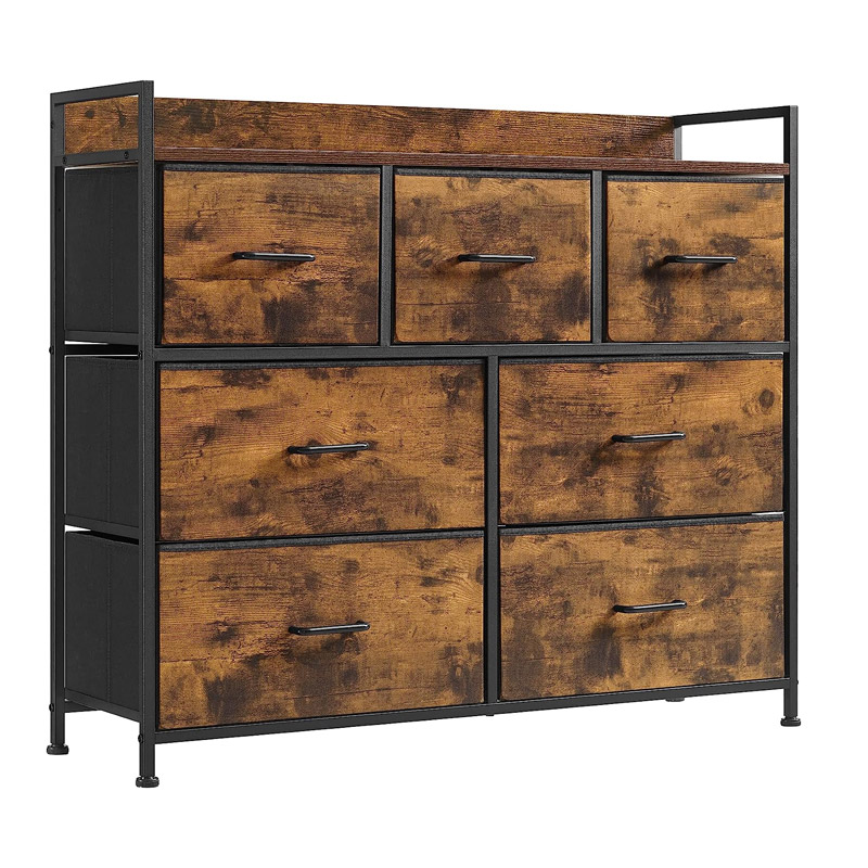 Η συρταριέρα, από την εταιρία VASAGLE, έχει βιομηχανικό σχεδιασμό με μεταλλικό σκελετό. Εξοπλισμένη με 7 συρτάρια (4 μεγάλα και 3 μικρά) από ύφασμα Oxford με λαβές, μεγάλη επιφάνεια στο επάνω μέρος από MDF ξύλο και ρυθμιζόμενα πόδια. Οι ράγες στα πλάγια και η ανυψωμένη άκρη στο πίσω μέρος προστατεύουν τα αντικείμενά σας από το να πέσουν. Οι ράγες μπορούν να χρησιμοποιηθούν και ως λαβές για εύκολη μεταφορά.