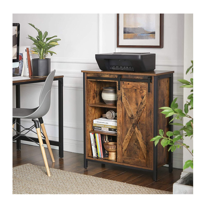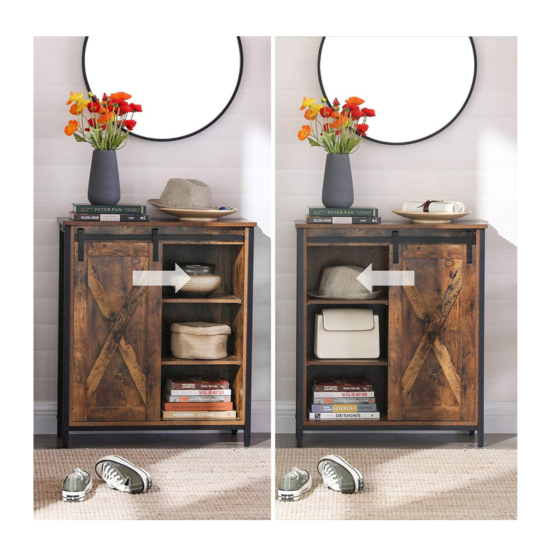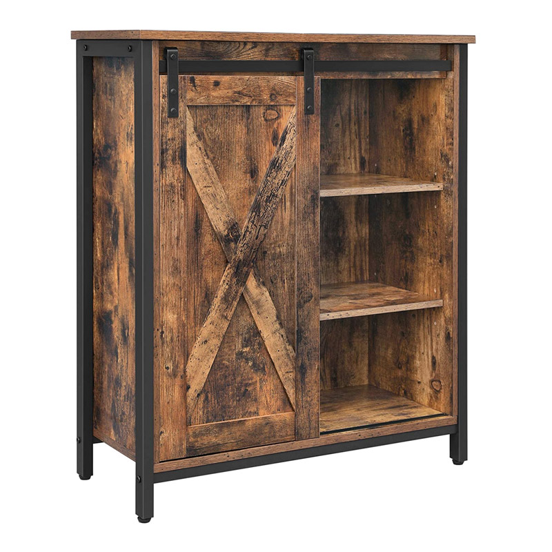 Το έπιπλο, από την εταιρία VASAGLE, διαθέτει βιομηχανικό σχεδιασμό με στιβαρό σκελετό από ατσάλι και μοριοσανίδες με ρουστίκ καφέ φινίρισμα. Διαθέτει συρόμενη πόρτα, για να μπορείτε να διαλέξετε ποια πλευρά του θα εκθέσετε και 3 ράφια - 2 εκ των οποίων ρυθμιζόμενα σε 3 επίπεδα. Εξοπλισμένο με ρυθμιζόμενα πόδια για να προσαρμόζεται σε όλα τα δάπεδα.