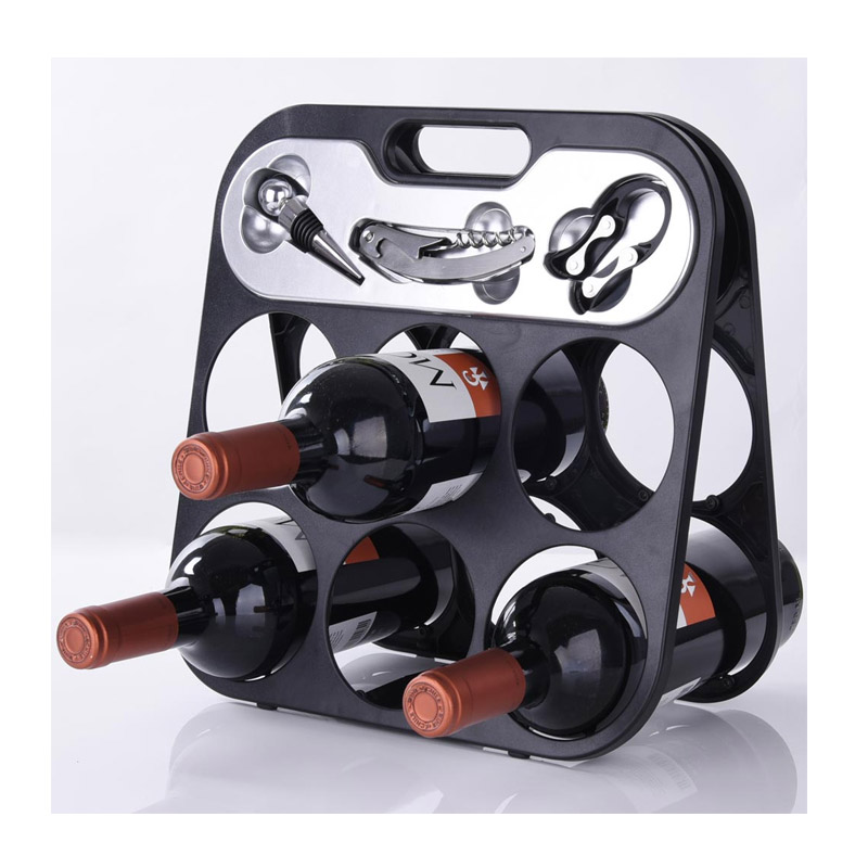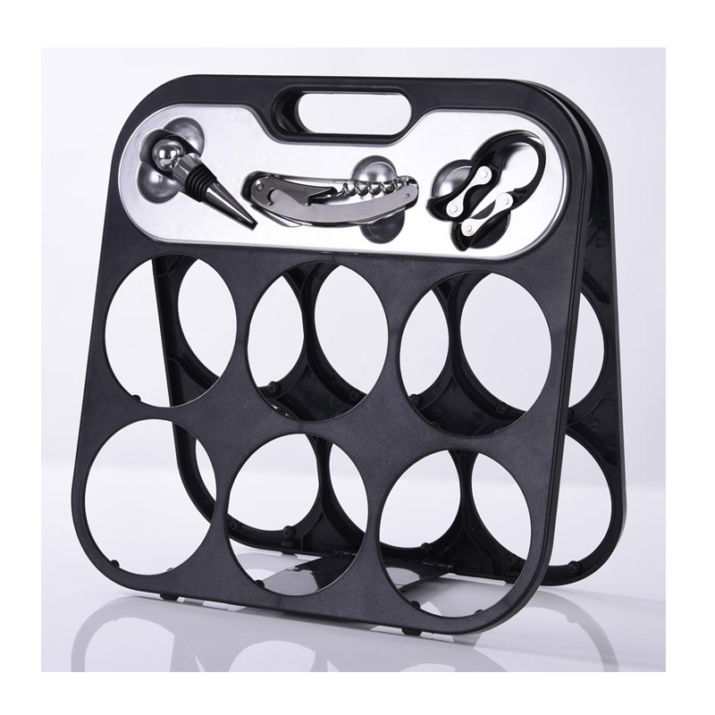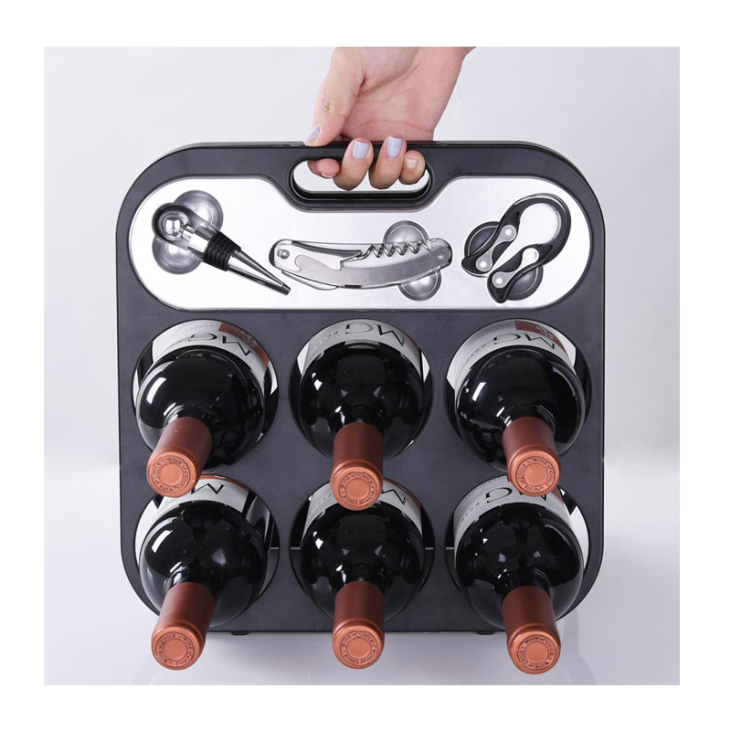 Η ραφιέρα κρασιών, από την εταιρία Bakaji, είναι κατασκευασμένη από πλαστικό ABS και χαλύβδινα μέρη. Προσφέρει χώρο για 6 μπουκάλια κρασιού, έχει λαβή για εύκολη μεταφορά και 3 αξεσουάρ (ανοιχτήρι μπουκαλιών Somelier, κόφτη αλουμινίου και καπάκι αρώματος).