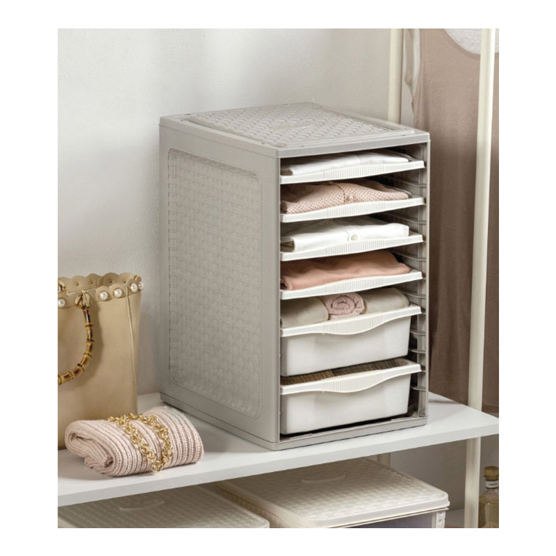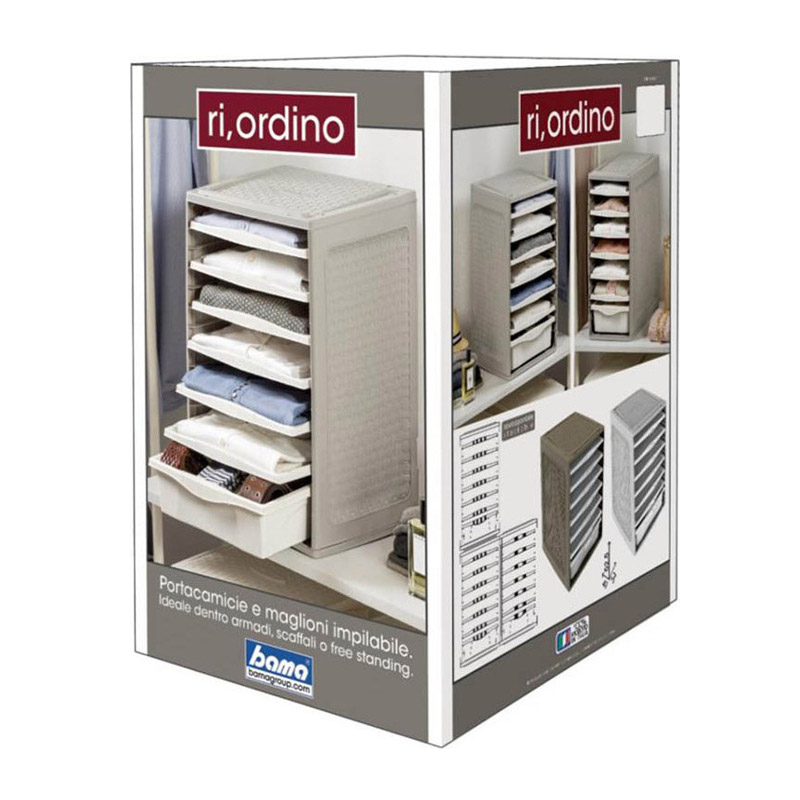 Η συρταριέρα αποθήκευσης ρούχων, από την εταιρία Bama, είναι κατασκευασμένη από πλαστικό υψηλής αντοχής. Διαθέτει 4 εσωτερικούς δίσκους και 2 εσωτερικά ράφια για αποθήκευση ρούχων όπως μπλούζες, πουλόβερ, πουκάμισα, παντελόνια, εσώρουχα, τα οποία μπορούν να ρυθμιστούν ως προς το ύψος προσφέροντας τις απαραίτητες αποθηκευτικές λύσεις για ογκώδη ρούχα.