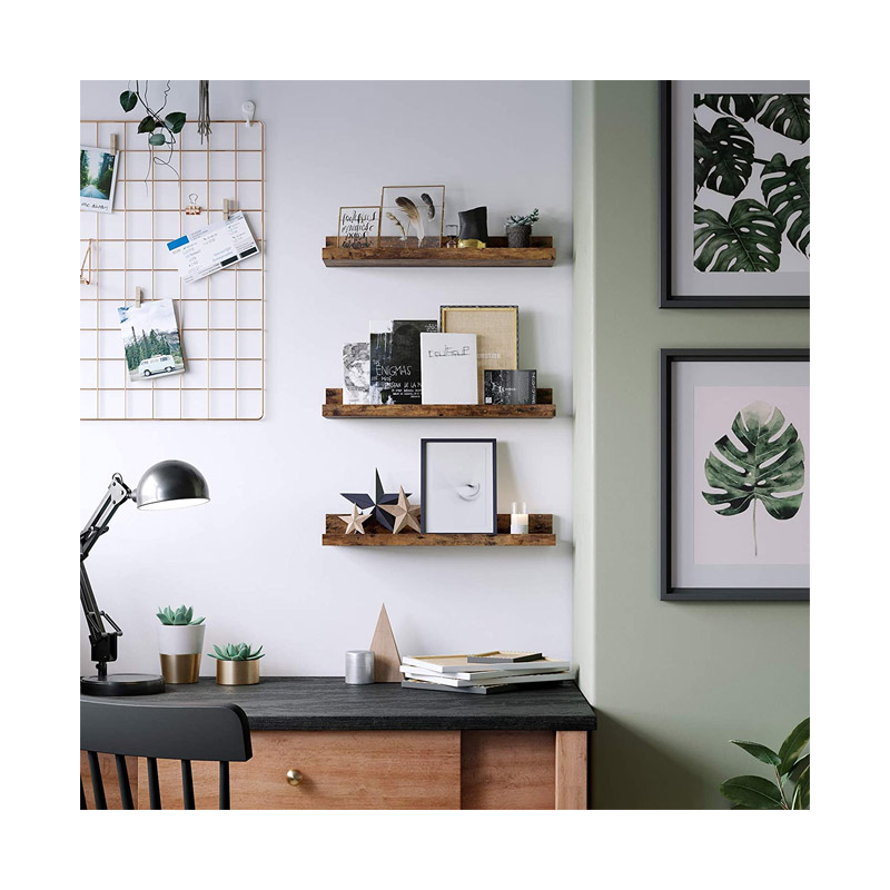 Τα επιτοίχια ράφια, από την εταιρία VASAGLE, διαθέτουν ανθεκτικό, αδιάβροχο σκελετό από MDF ξύλο σε καφέ απόχρωση. Τα 3 ράφια έχουν προεξοχή ύψους 2 cm στο μπροστινό μέρος η οποία εξασφαλίζει ότι τα αντικείμενα που τοποθετείτε είναι σταθερά και κάθε ράφι μπορεί να φορτωθεί έως και 5 κιλά. Χάρη στον απλό σχεδιασμό τους ταιριάζουν σε κάθε δωμάτιο.