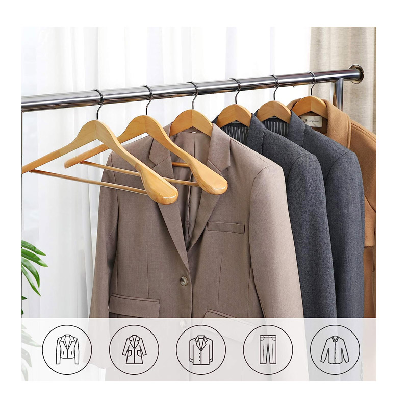 Το σετ, από την εταιρία Songmics, περιλαμβάνει 6 κρεμάστρες από μασίφ ξύλο, κατάλληλες για κοστούμια, πουκάμισα, παντελόνια ή χειμωνιάτικα παλτό. Κάθε κρεμάστρα έχει μεταλλικό, επιχρωμιωμένο και περιστρεφόμενο γάντζο και μπορεί να σηκώσει βάρος έως 5.5 Kg.