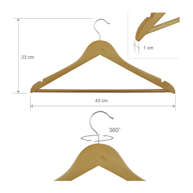 Το σετ, από την εταιρία Bakaji, αποτελείται από 8 ξύλινες κρεμάστρες με μεταλλικούς γάντζους. Επιπρόσθετα, έχουν πλαϊνές εγκοπές για να κρεμάσετε φούστες, χωρίς να ανησυχείτε για την ολίσθηση. Κατάλληλες για όλα τα ρούχα, καθώς και για μπουφάν και παλτό.