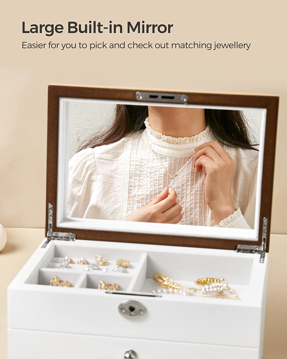 Κομψή & Σικ: Με τις καθαρές γραμμές, το κομψό λευκό πλαίσιο και το καπάκι με πλούσια υφή ξύλου, αυτή η κοσμηματοθήκη 3 επιπέδων φέρνει μια αίσθηση φρεσκάδας και σίγουρα θα αποτελέσει μια σικ προσθήκη στο τραπέζι του καλλωπισμού σας.