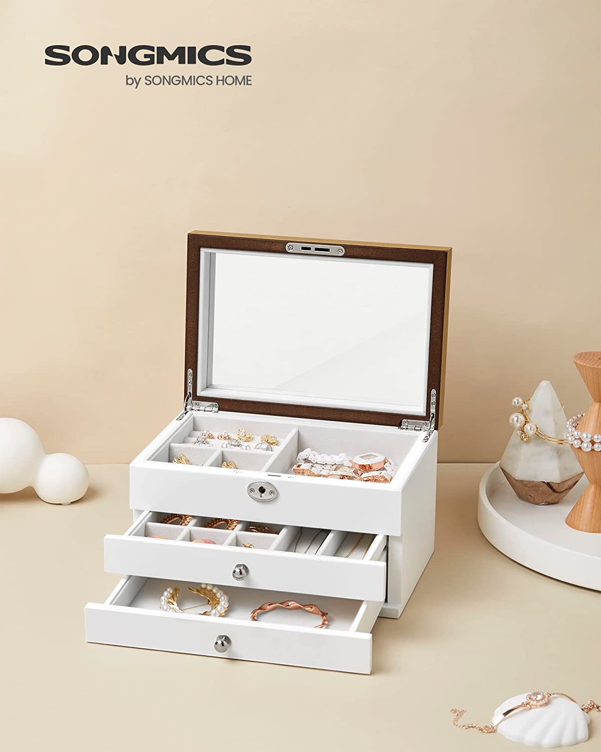 SONGMICS Ξύλινη Μπιζουτιέρα - Κοσμηματοθήκη 3 Επιπέδων με Κλειδαριά και Καθρέφτη 17 x 25 x 15 cm, Λευκό JOW15WNV1