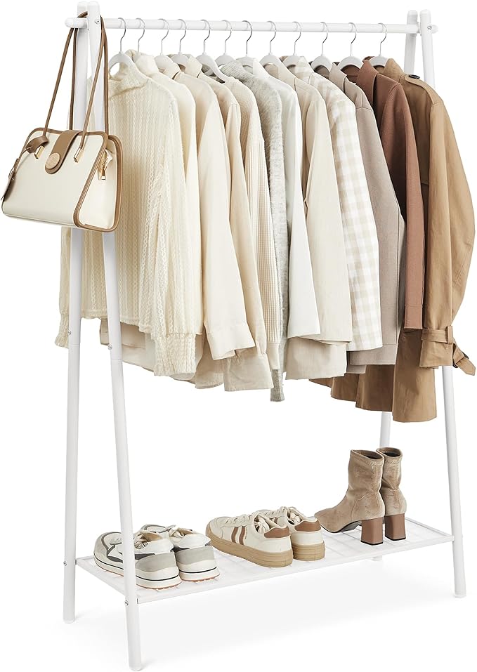 Ευέλικτη Χρήση: Η κρεμάστρα διαθέτει ψηλή ράγα που φιλοξενεί ρούχα διαφόρων μηκών, ενώ το κάτω ράφι προσφέρει χώρο για κουτιά αποθήκευσης. Επιπλέον, υπάρχει αρκετός χώρος κάτω από το ράφι για παντόφλες, μοκασίνια και άλλα.