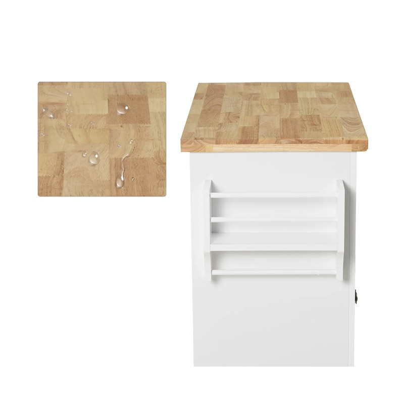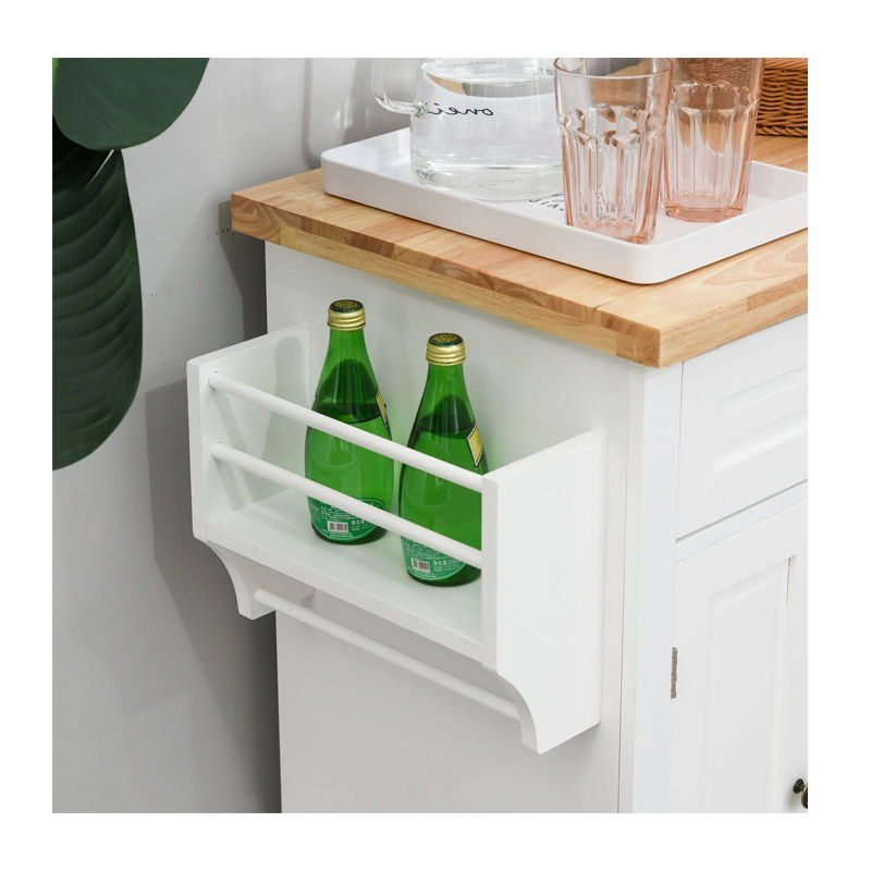 Το έπιπλο κουζίνας, από την εταιρία HOMCOM, είναι κατασκευασμένο από μασίφ MDF και μοριοσανίδες, για ανθεκτική χρήση και εύκολη συντήρηση. Διαθέτει 1 μεγάλο πάγκο στην κορυφή, 2 συρτάρια, 2 ντουλάπια με ρυθμιζόμενα ράφια στο εσωτερικό τους, 1 ράφι για μπαχαρικά και 1 ράγα για πετσέτες. Είναι εξοπλισμένο με 4 τροχούς ομαλής κύλισης (2 με φρένα κλειδώματος), για εύκολη μεταφορά.