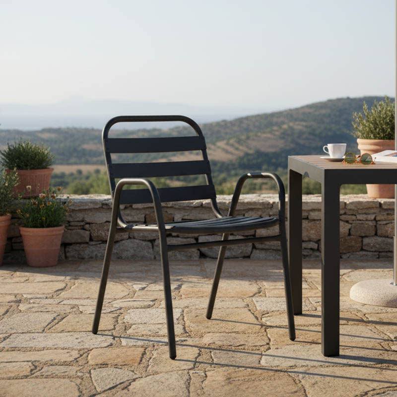 Σταθερός σκελετός από μέταλλο εξαιρετικής ποιότητας με αντοχή σε φθορά και χρόνο, ενώ τα κομμάτια έδρας και πλάτης είναι κατασκευασμένα από φέτες αλουμινίου. Το μέταλλο παρέχει ανθεκτικότητα και σταθερότητα, ενώ οι φέτες αλουμινίου προσθέτουν ελαφρότητα και μια μοντέρνα αίσθηση στον σχεδιασμό. Η πολυθρόνα αυτή είναι ιδανική για χρήση σε εξωτερικούς χώρους, καθώς η ανθεκτικότητα στις καιρικές συνθήκες του αλουμινίου την καθιστά ανθεκτική σε έκθεση στον ήλιο και την υγρασία.