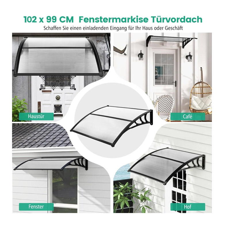 Το κιόσκι - τέντα πόρτας εισόδου, από την εταιρία Costway, είναι κατασκευασμένο από πάνελ PC υψηλής ποιότητας, συμπαγή τριγωνικά στηρίγματα ABS και στιβαρούς πόλους αλουμινίου, που μπορούν να αντισταθούν αποτελεσματικά στη σκουριά και να εξασφαλίσουν μακροχρόνια αντοχή. Τα κοίλα πάνελ μπορούν επίσης να βοηθήσουν στη μείωση της θερμότητας από τον ήλιο που καίει.