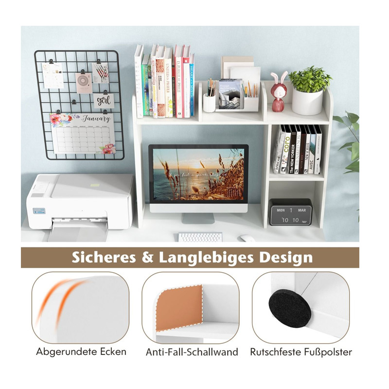 Η επιτραπέζια ραφιέρα γραφείου, από την εταιρία Costway, είναι κατασκευασμένη από ξύλο υψηλής ποιότητας. Τοποθετείται πάνω στο γραφείο (με επιπρόσθετη στήριξη στον τοίχο για μέγιστη ασφάλεια), δίνοντας άφθονο χώρο αποθήκευσης. Εξοπλισμένη με 5 ράφια και χώρο γιο οθόνη υπολογιστή έως 27 ίντσες.