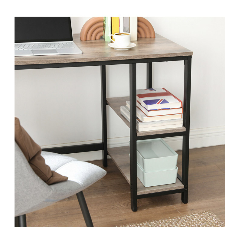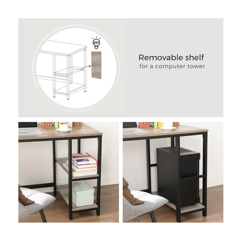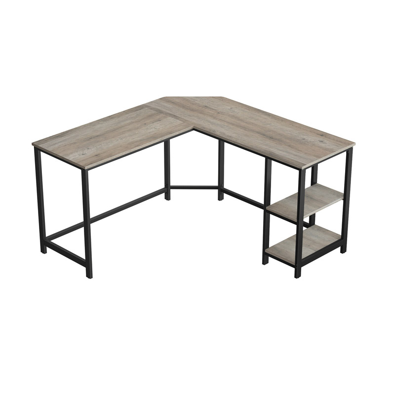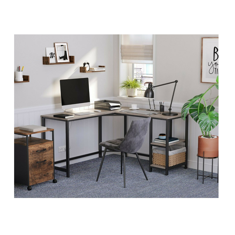 Το γωνιακό γραφείο σε σχήμα L, από την εταιρία VASAGLE, διαθέτει ατσάλινο πλαίσιο και επιφάνεια από μοριοσανίδες σε γκρι φινίρισμα. Στο κάτω μέρος διαθέτει 2 ράφια, με το πάνω ράφι αφαιρούμενο για να δημιουργηθεί χώρος για έναν πύργο υπολογιστή.