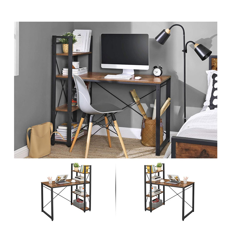 Το γραφείο, από την εταιρία VASAGLE, έχει βιομηχανικό σχεδιασμό και διαθέτει μεταλλικό σκελετό από ατσάλι και επιφάνεια από μοριοσανίδες. Είναι αρκετά μεγάλο για να τοποθετήσετε έναν υπολογιστή, εκτυπωτή, βιβλία κ.α. Έχει 4 πλαϊνά ράφια, τα οποία μπορούν να τοποθετηθούν στην αριστερή ή την δεξιά πλευρά, ώστε να σας προσφέρει επιπλέον αποθηκευτικό χώρο για έγγραφα, γραφική ύλη ή διακοσμητικά. Έχει άφθονο χώρο για τα πόδια σας, ενώ μπορεί να χωρέσει εύκολα την καρέκλα από κάτω.
